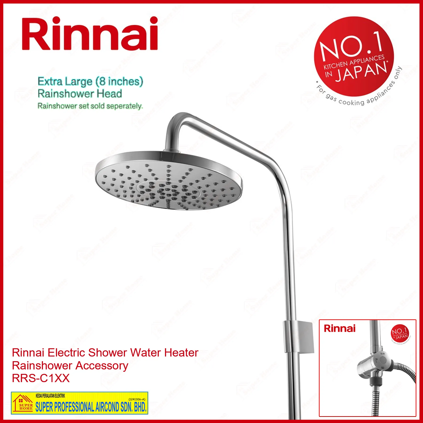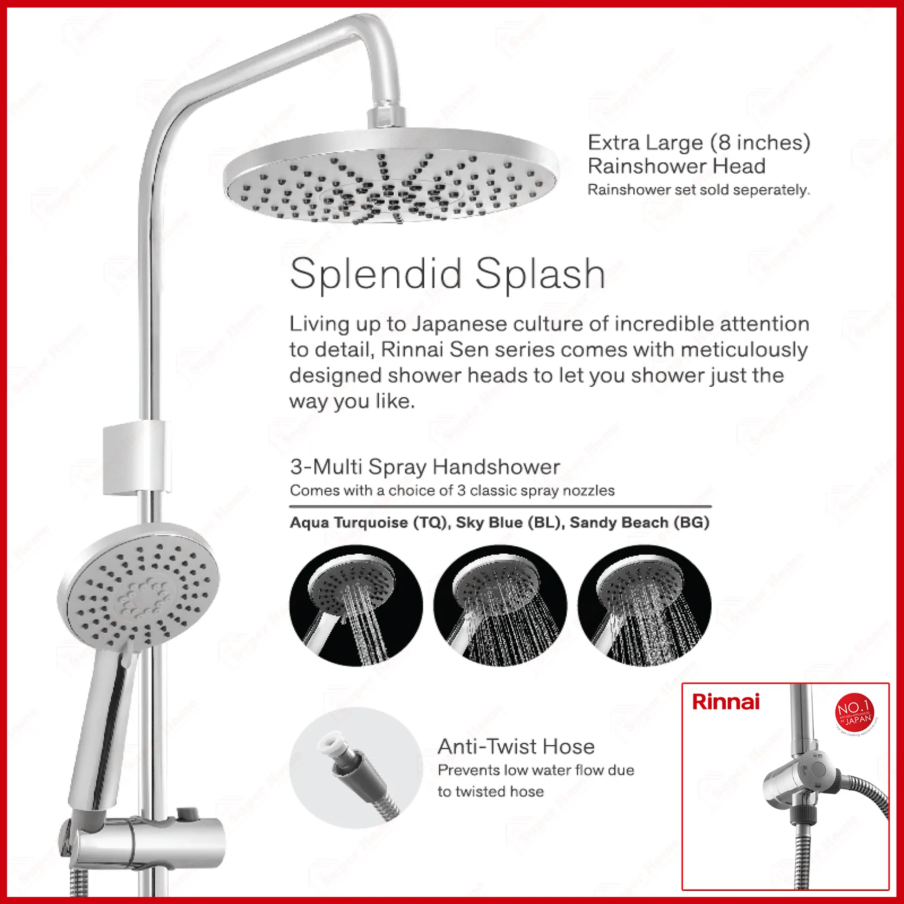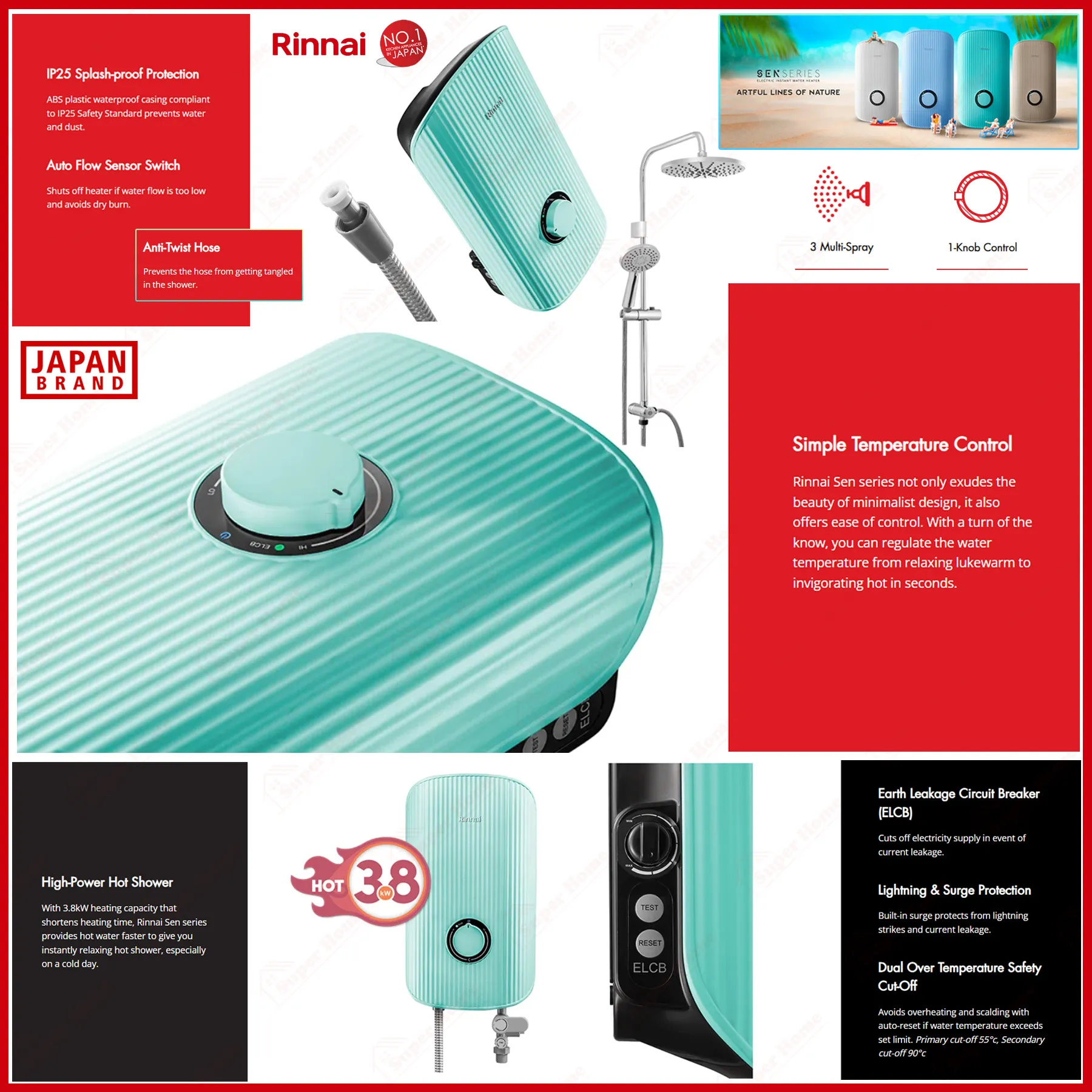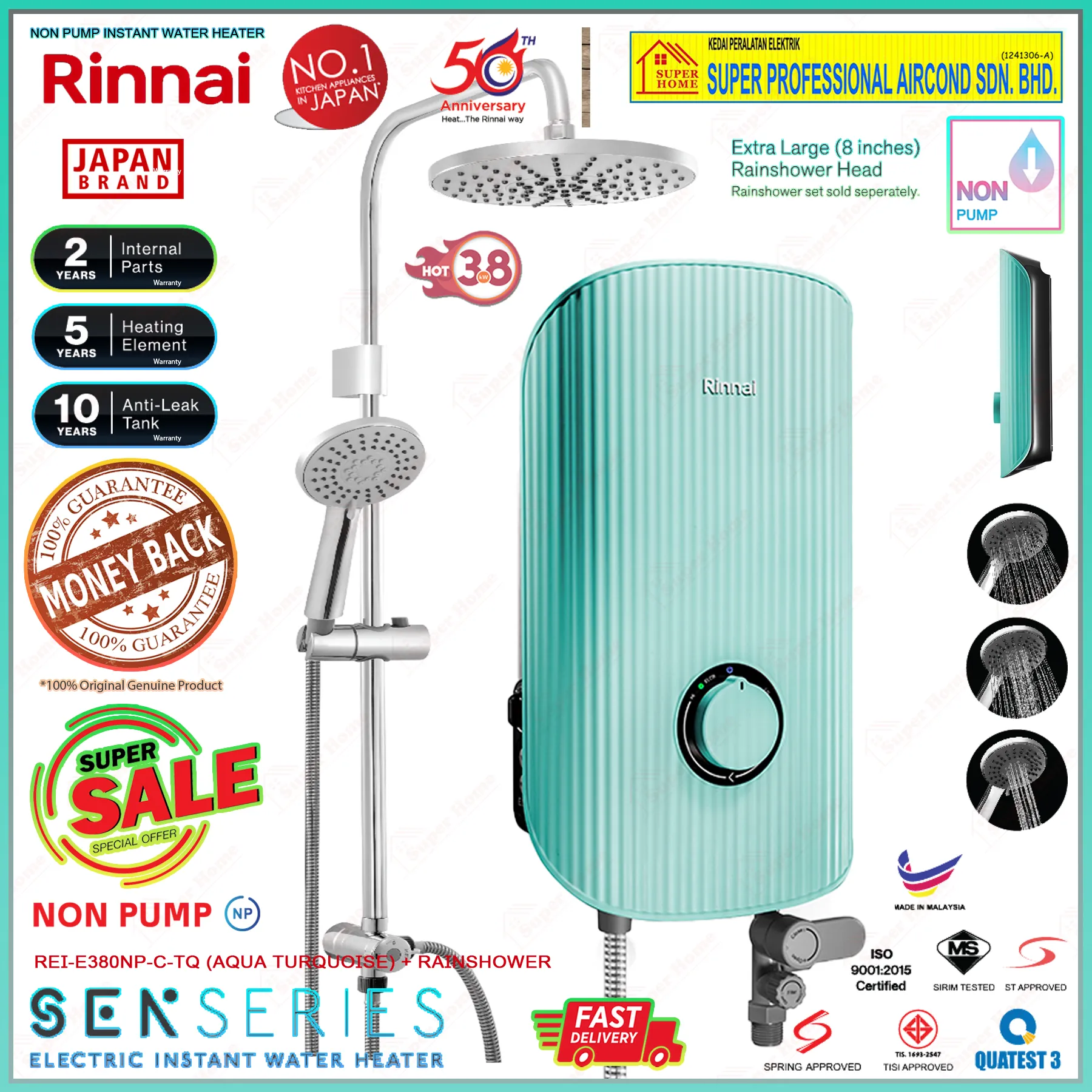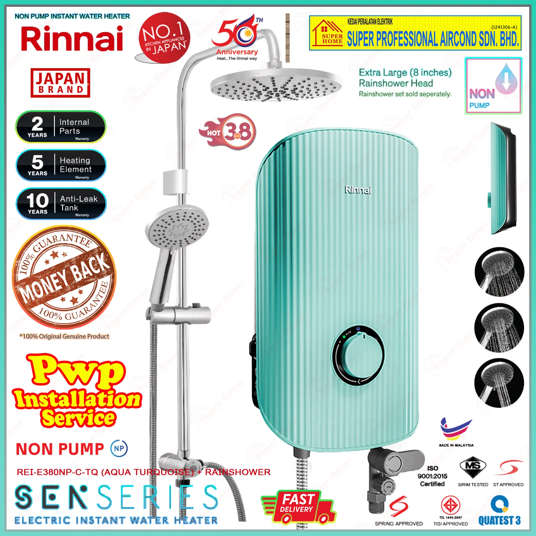 Rinnai Water Heater REI-E380NP-C-TQ (AQUA TURQUOISE) Non-Pump Instant Electric Water Heater + Rain Shower Accessory