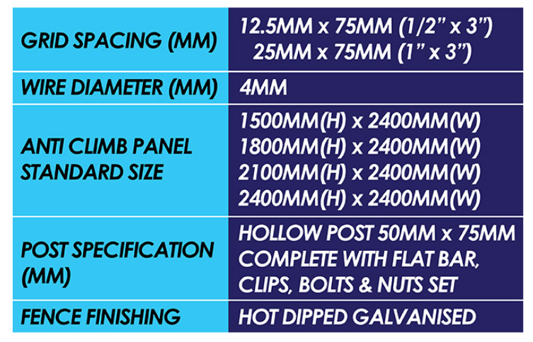 CHENG HUAT HARDWARE (SENTUL) SDN BHD Products ANTI-CLIMB FENCE Standard Width 8 Feet - HOT DIPPED Spacing 1/2¡° X 3" (12.5mm X 75mm) / 1" X 3" (25mm X 75mm) Square Post "˜65mm X 65mm Complete With End Cap, Spider Clips, Bolts & Nuts Set