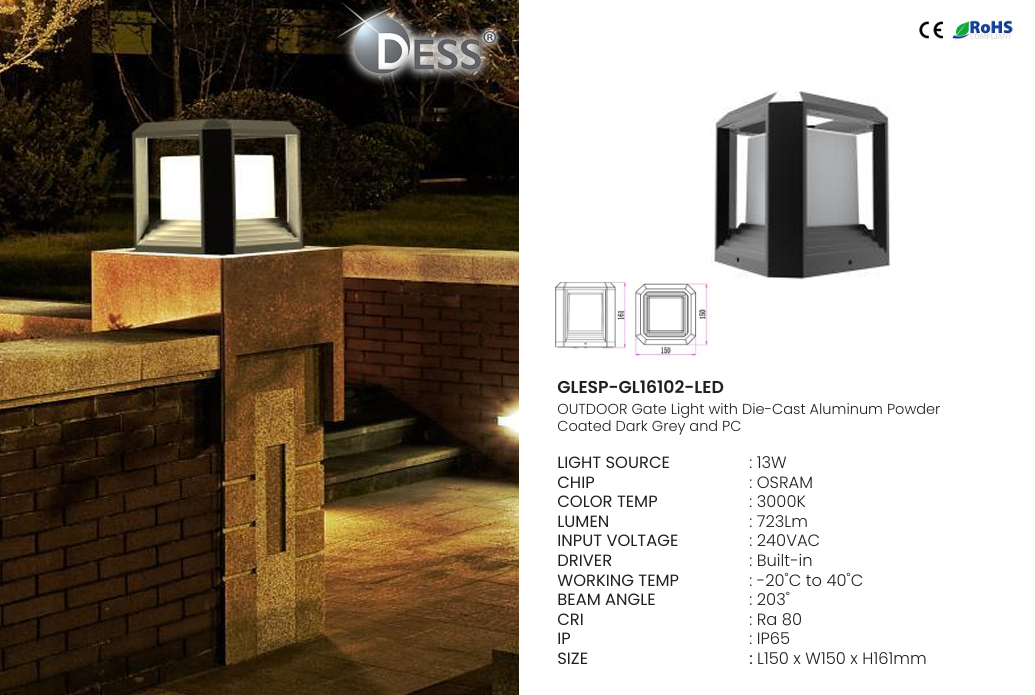 DESS GLESP-GL16102-LEDOUTDOOR GATE LIGHT 240V 13W 723LM 3000K IP65 CRI80