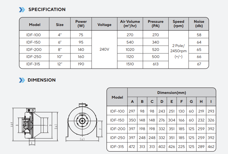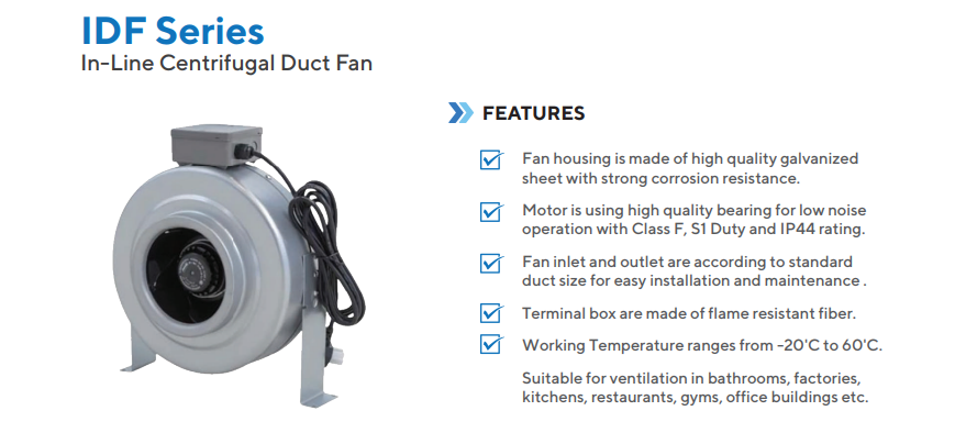 JLL Electrical Sdn Bhd Products POTENZA IDF SERIES CENTRIFUGAL IN-LINE DUCT FAN 240V [75W/95W/140W/160W/190W] [4''/6''/8''/10''/12'']