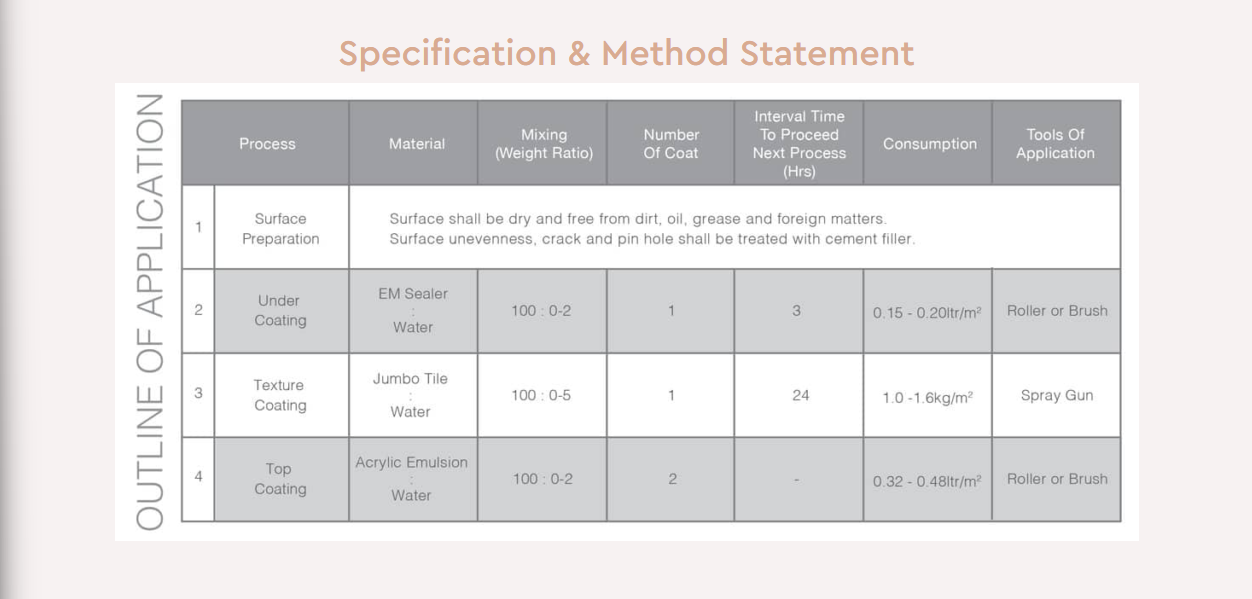 Thick, strong and easily applicable are some of the characteristics of our Jumbo Spray Tile. Inspired by the classic hue, our Jumbo Spray Tile offers the flexibility in texture patterns to create a classic or modern look for your interior and exterior building.