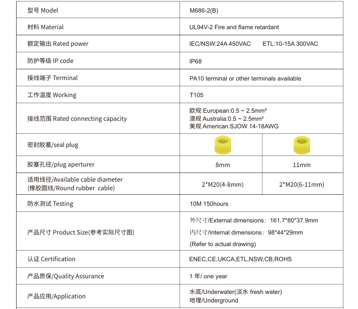JLUX M686-2 M20 PVC 2-WAY TERMINAL JUNCTION BOX CONNECTOR 24A 450V IP68 [M686-2A/M686-2B] [4-8MM/6-11MM]