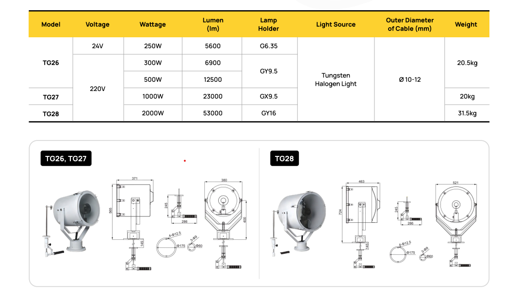 JLUX TG27/TG28 MARINE HIGH POWERED SEARCH LIGHT FOR MARINE SHIP NAVIGATION, RESCUE, LIFESAVING, WARNING AND AIR-SEA SEARCHING 220V IP56 [1000W/2000W] [23000LM/53000LM] Product Descrip...