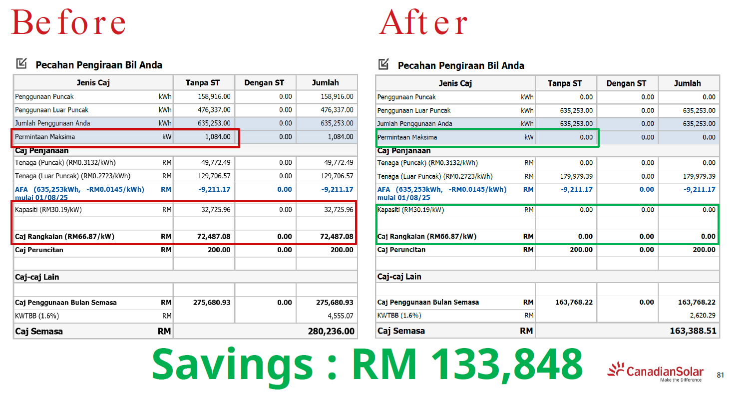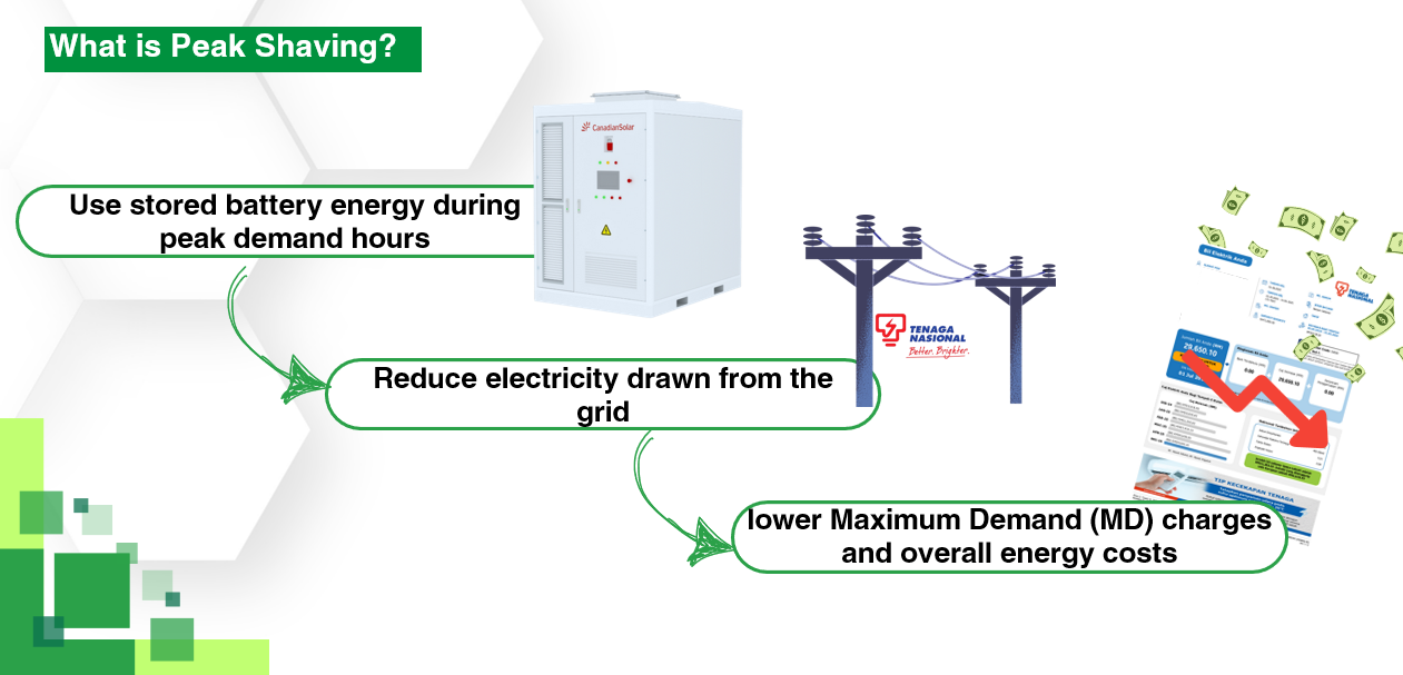 This reduces Maximum Demand (MD) recorded by TNB, directly lowering monthly demand charges.