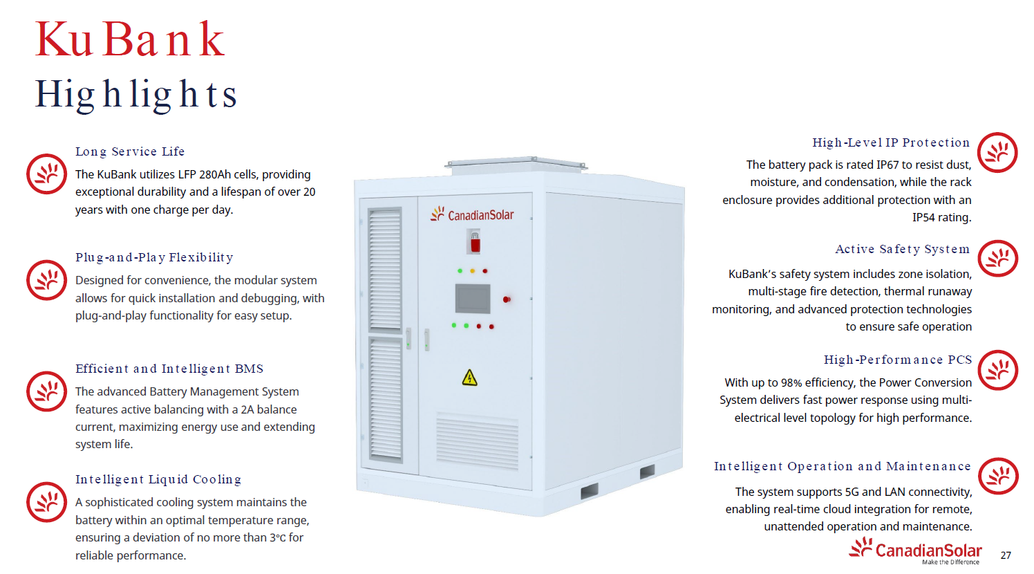 The Canadian Solar KuBank is a modular, high-performance Battery Energy Storage System (BESS) designed to optimize energy use for commercial and industrial facilities. Integrated with a smart Energy Management System (EMS), the KuBank allows users to strategically manage load profiles, reduce maximum demand charges, and improve overall energy efficiency.