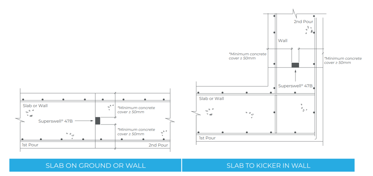 Superswell® 47B Hydrophilic Butyl Waterstop Seal is a unique sealing compound which expands in a controlled fashion when exposed to moisture, forming a compression seal in concrete joints. Superswell® 47B is ideal for use in horizontal and vertical construction joints for cast in-situ concrete structures. Superswell® 47B is manufactured utilising a specialised mixing process which encapsulates hydrophilic materials into a Butyl base creating a controlled, moisture-activated seal. The product has the structural integrity and the long term durability features of Butyl, as well as the ability to expand to create a SELF-HEALING JOINT WATERSTOP SEAL. Superswell® 47B has been tested to withstand a 60 metre (6.0 Bar) head of water pressure in potable and salt water conditions and can expand up to 180% after 30 days of continual submersion in distilled water. Superswell® 47B complies to NSF/ANSI Standard 61 Drinking Water System Components – Health Effects, ensuring Superswell® 47B is safe for use in drinking water applications. Therefore, it is suitable to use in various potable water retaining structures like water tanks, swimming pools and reservoirs.