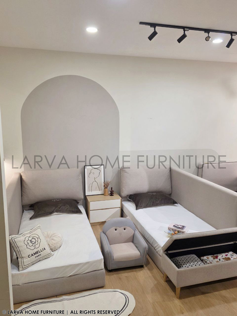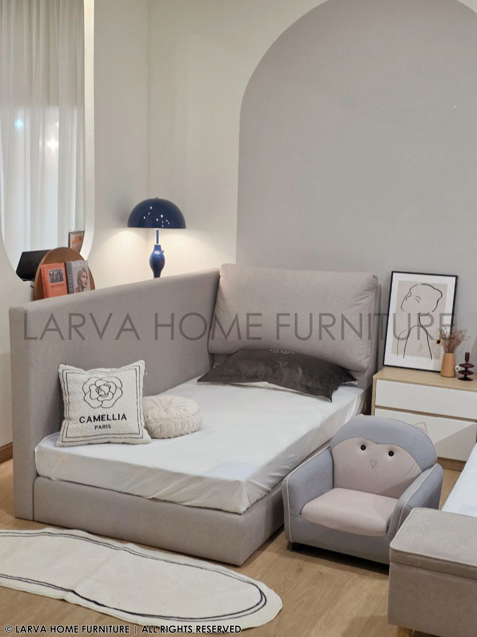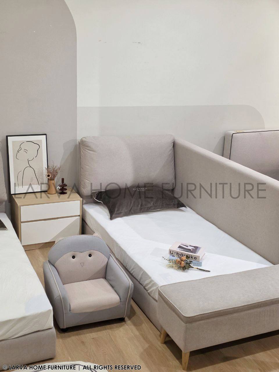 This Pansy Bed Frame is designed with safety, softness, and comfort in mind. The high padded sides create a secure sleeping environment, while the gentle color tone blends seamlessly with any modern n...