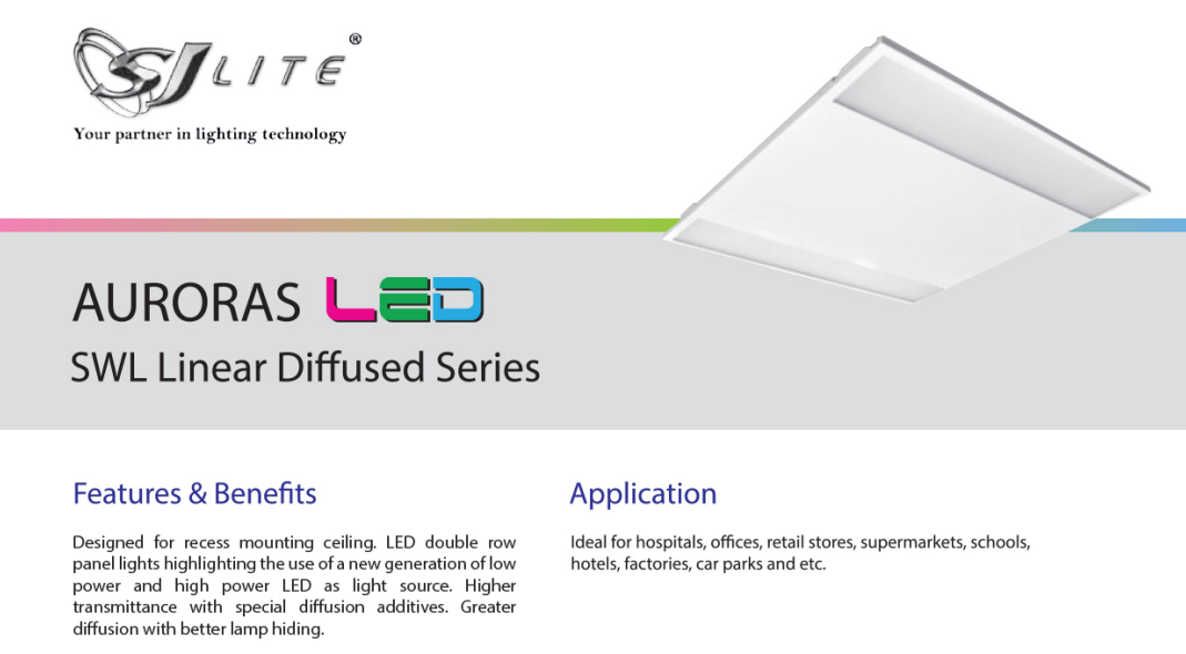 The SJLITE SWL AURORAS SERIES LED RECESSED LINEAR DIFFUSED DOUBLE ROW PANEL LIGHT 240V IP20 CRI80 [1X2/1X4/2X2/2X4] [12W/17W/23W/34W/46W/69W] [1250LM/1800LM/2550LM/2600LM/2650LM/3700LM/3750LM/5350LM/7750LM] [3000K/4000K/6500K] [30,000HRS/50,000HRS] is designed to deliver high-performance, uniform illumination with maximum energy efficiency. Its innovative double-row LED configuration ensures brighter, cleaner, and more evenly diffused lighting than standard panel lights, making it ideal for commercial, industrial, and modern residential applications.