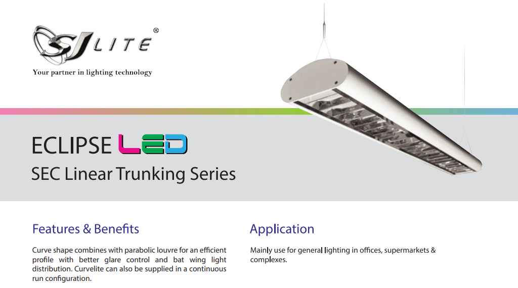 The SJLITE SEC ECLIPSE SERIES LED LINEAR TRUNKING PENDANT LIGHT 240V IP20 CRI80 [23W/34W] [2350LM/3350LM] [3000K/4000K/6500K] [30,000HRS/50,000HRS] is designed for modern commercial and architectural lighting needs. Engineered for high efficiency and visual comfort, this pendant-style linear trunking light delivers uniform, glare-minimised illumination ideal for open and work-focused spaces.