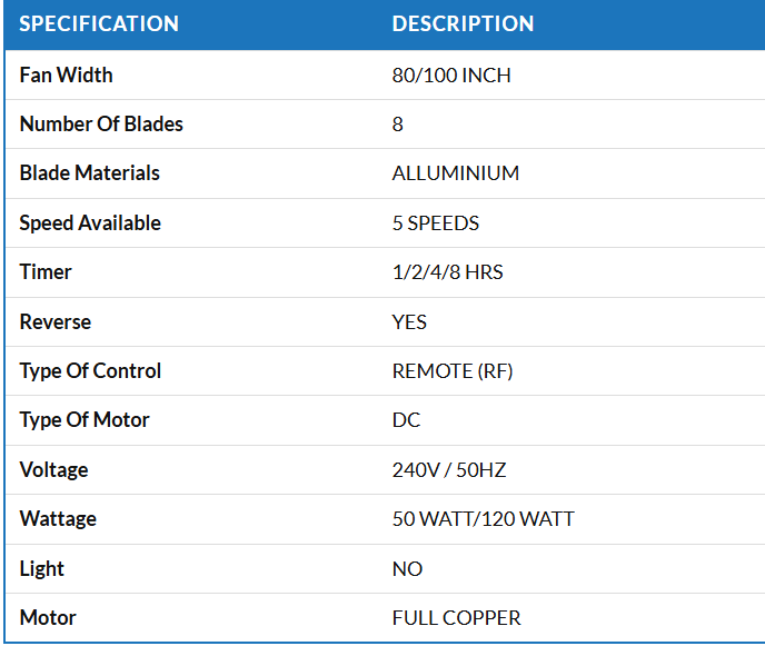 MAVA 80" /100" DC CEILING FAN TITAN 80/ TITAN 100 The MAVA Titan Series takes ceiling fans to the next level with its extra-large sizes of 80″ and 100″, built f...