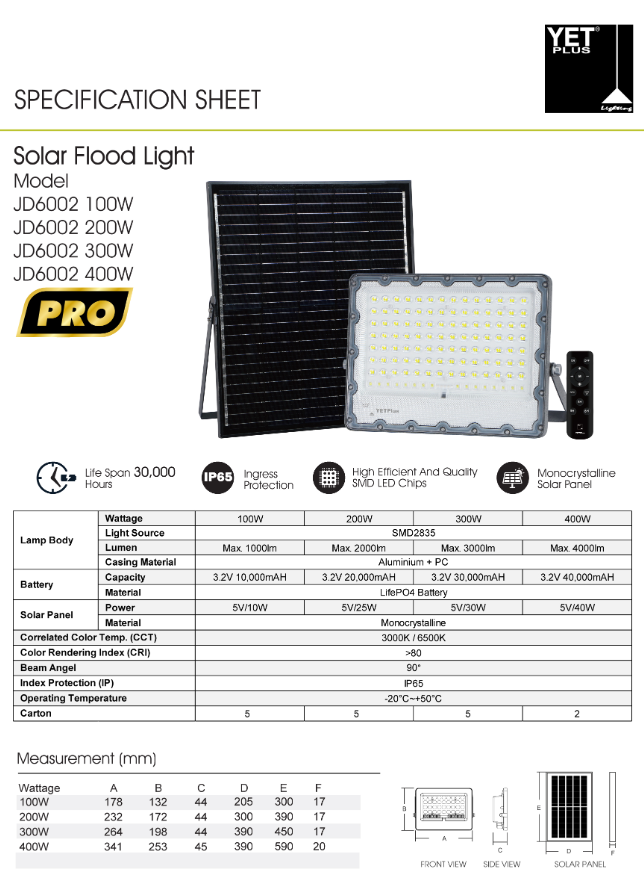 YETPLUS JD6002 LED SOLAR FLOODLIGHT 30,000HRS IP65 [100W/200W/300W/400W] [1000LM/2000LM/3000LM/4000LM] [3000K/6500K]