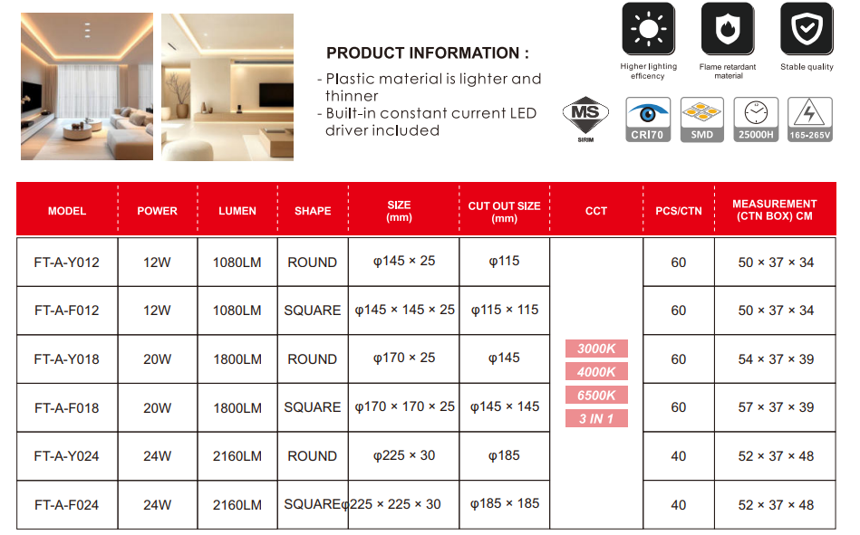 Operating at 265V, the downlight is available in 12W, 20W, and 24W variants, delivering efficient brightness levels of 1,080 lumens, 1,800 lumens, and 2,160 lumens respectively. With a 25,000-hour lifespan, it minimizes maintenance and replacement costs. The CRI70 rating provides natural and comfortable illumination for everyday indoor use.