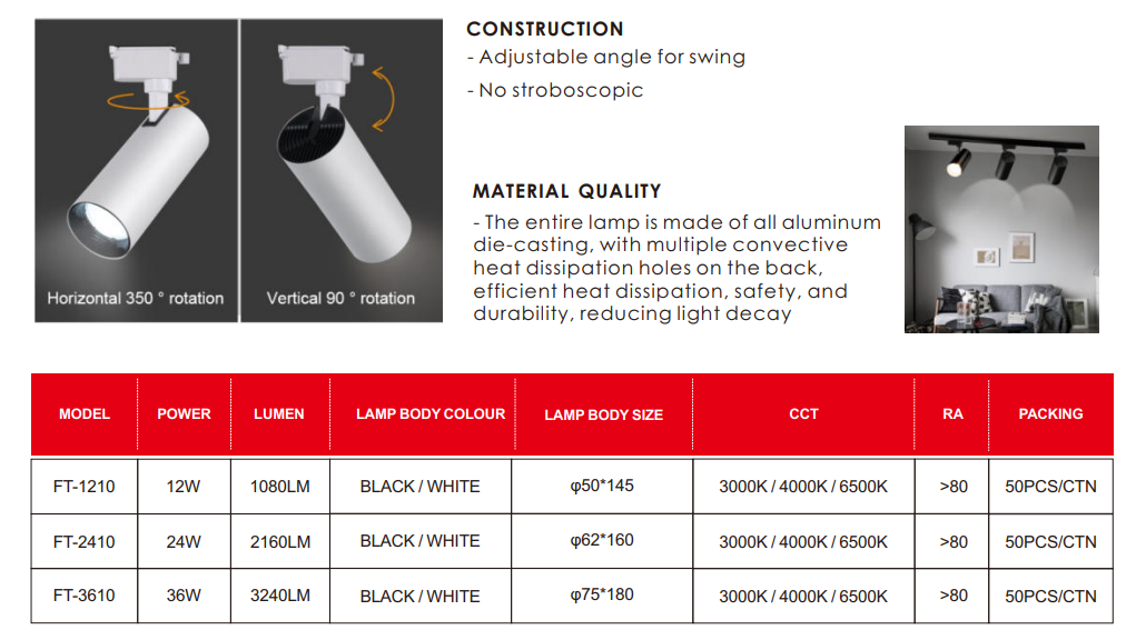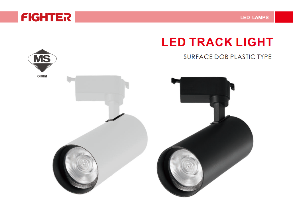 The FIGHTER E-SERIES LED SURFACE TRACKLIGHT DOB PLASTIC TYPE 265V CRI80 IP20 [12W/24W/36W] [1080LM/2160LM/3240LM] [3000K/4000K/6500K] [BLACK/WHITE] (SIRIM APPROVED) is a versatile and energy-efficient lighting solution designed for modern retail, commercial, and residential interior spaces. Featuring a surface-mounted tracklight design, it offers focused illumination and flexible lighting arrangements.