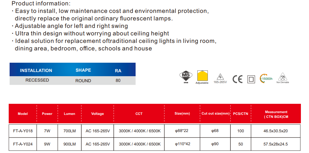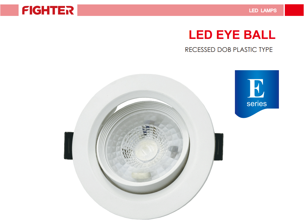 The FIGHTER E-SERIES ROUND LED RECESSED EYEBALL DOB PLASTIC TYPE 265V 15,000HRS IP20 CRI80 [7W/9W] [700LM/900LM] [3000K/4000K/6500K] (SIRIM APPROVED) is a compact and efficient directional lighting solution designed for precise illumination in modern indoor spaces. With its adjustable eyeball design, this recessed light allows users to direct light exactly where it is needed, making it ideal for accent lighting, feature walls, and focused task lighting.