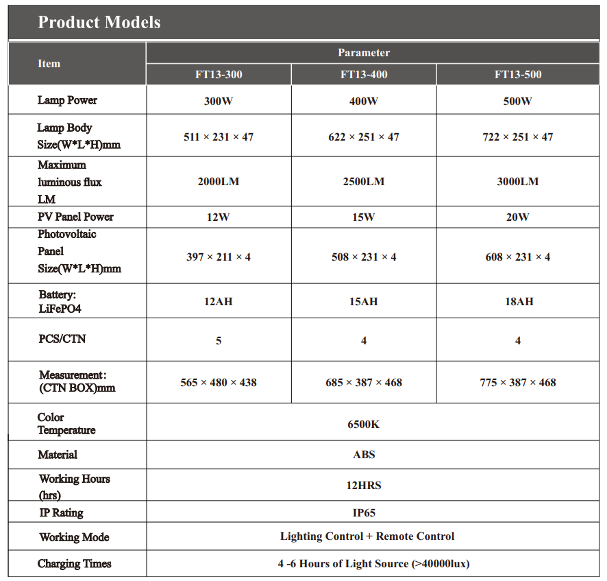 Built for outdoor durability, the light features a robust IP65-rated housing, providing strong protection against dust, rain, and harsh weather conditions. Available in 300W, 400W, and 500W options, it offers lumen outputs of 2,000LM, 2,500LM, and 3,000LM, making it suitable for different lighting coverage requirements.