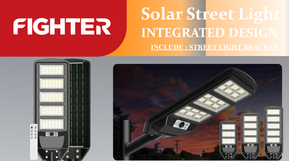 The FIGHTER INTEGRATED DESIGN LED SOLAR STREETLIGHT C/W STREETLIGHT BRACKET & REMOTE CONTROL 6500K IP65 [300W/400W/500W] [2000LM/2500LM/3000LM] is the perfect solution for customers searching for solar streetlights, LED solar street lights, or lighting and electrical shops near me, offering durability, convenience, and trusted FIGHTER quality.