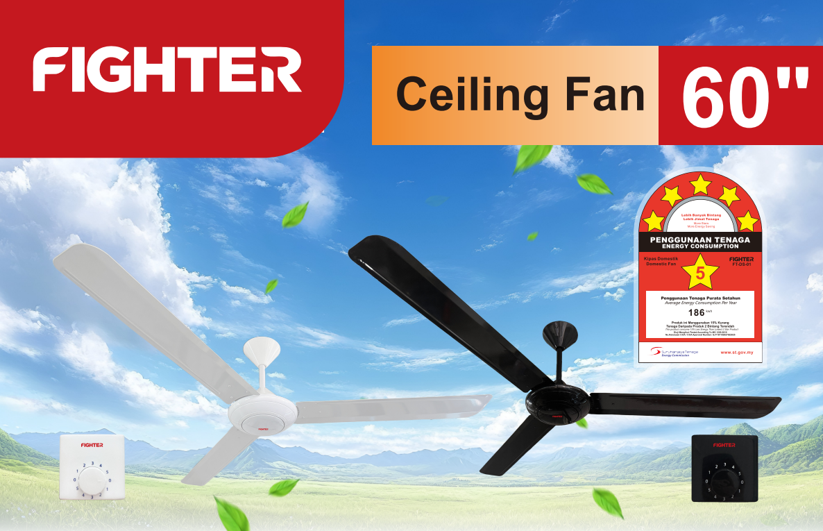 The FIGHTER 60” 3-Blade Ceiling Fan is an excellent choice for customers searching for ceiling fans near me, energy-efficient ceiling fans, or SIRIM approved ceiling fans, offering dependable performance, modern styling, and trusted FIGHTER quality.