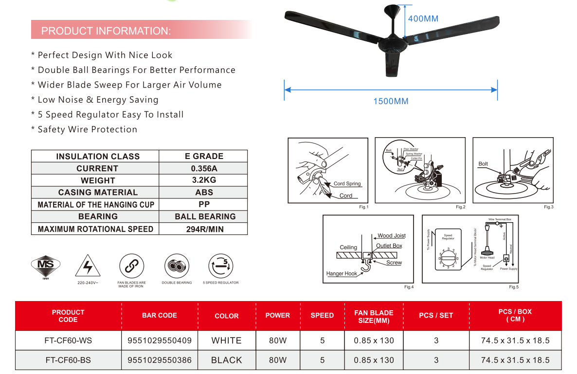 Featuring a 60-inch blade span and a 3-blade aerodynamic design, the fan delivers strong and consistent airflow while maintaining quiet operation. Powered by an 80W motor and operating at 220–240V, it ensures stable performance suitable for everyday use.
