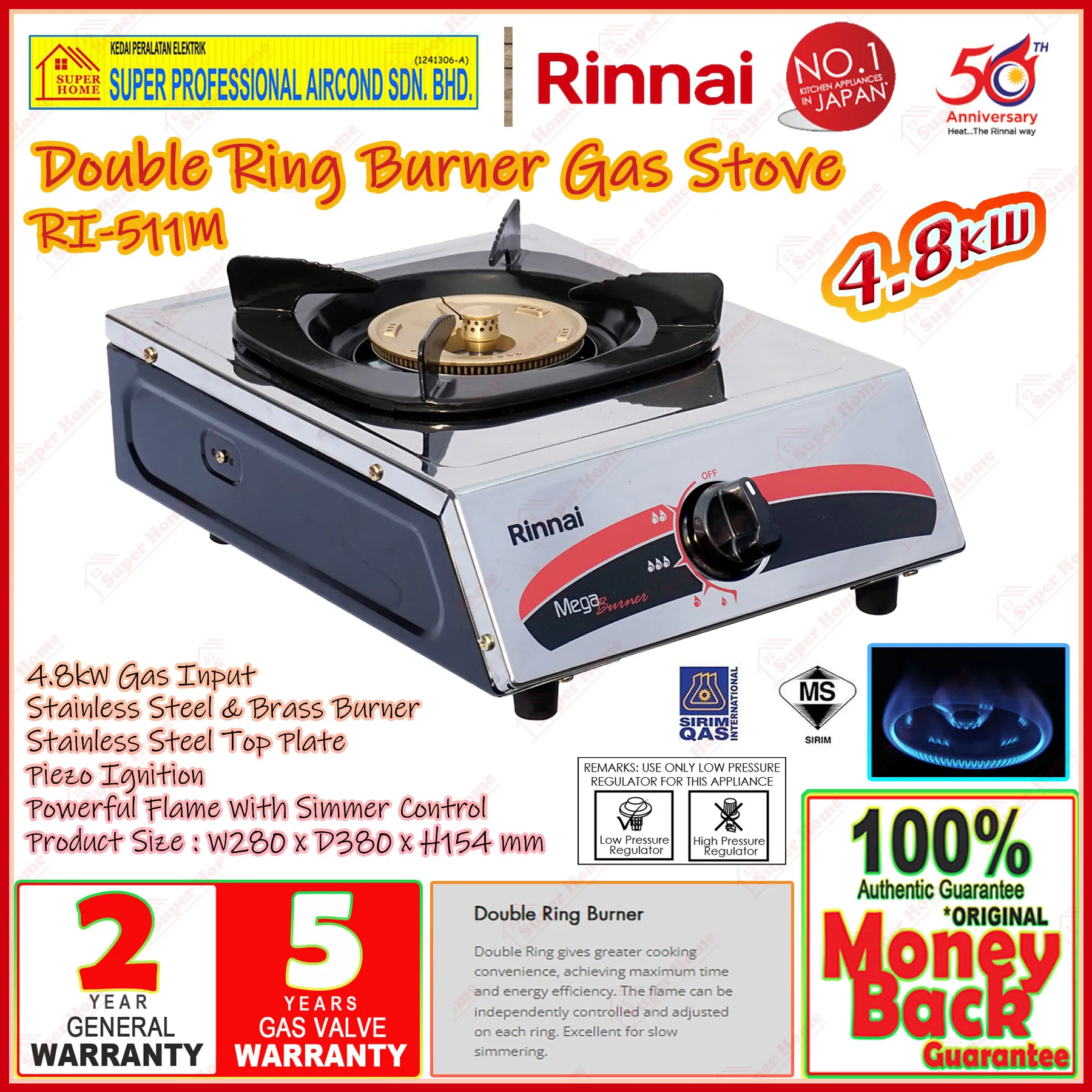 Super Professional Aircond Sdn Bhd Products Rinnai Gas Cooker RI-511M Mega Burner Table Top Gas Stove 4.8kW