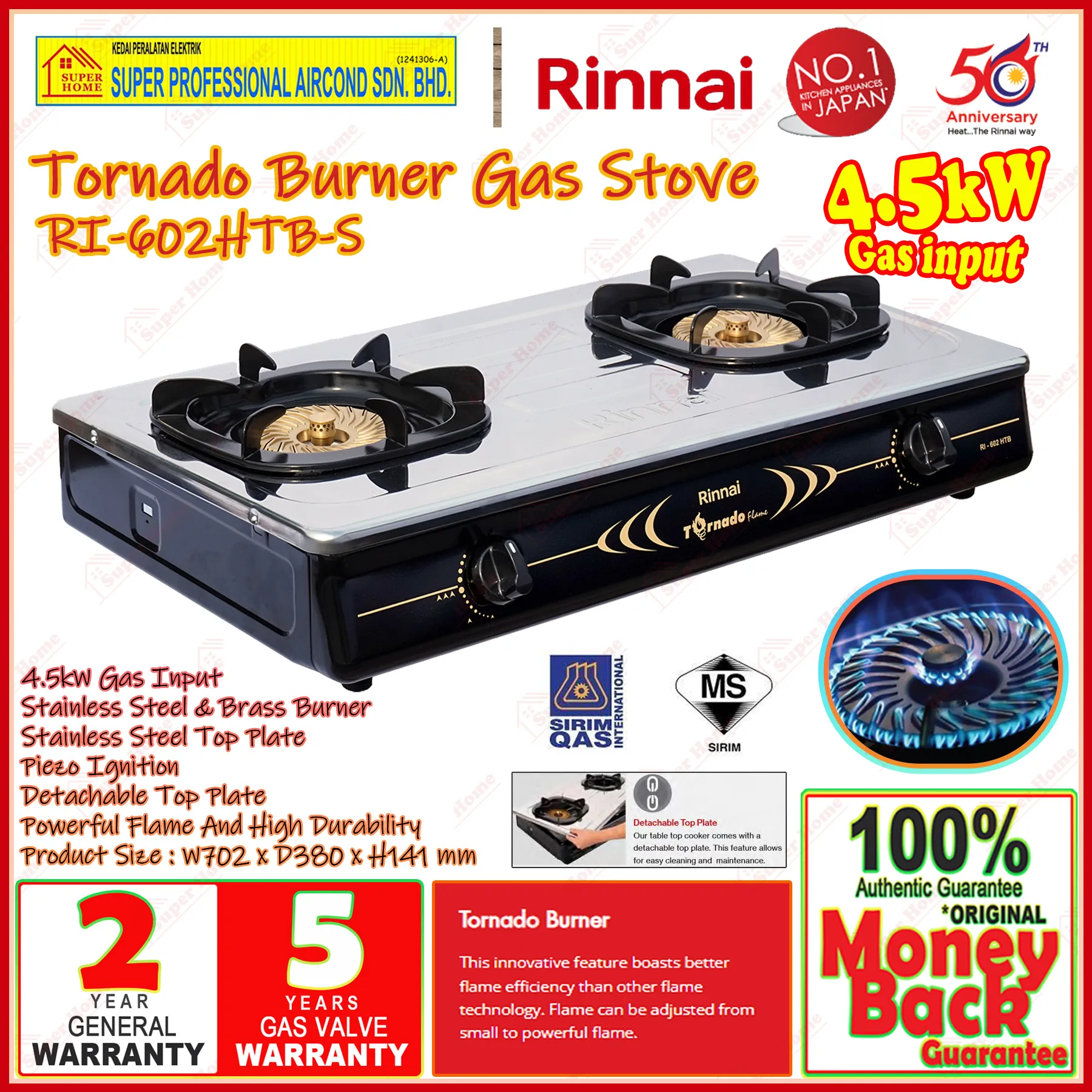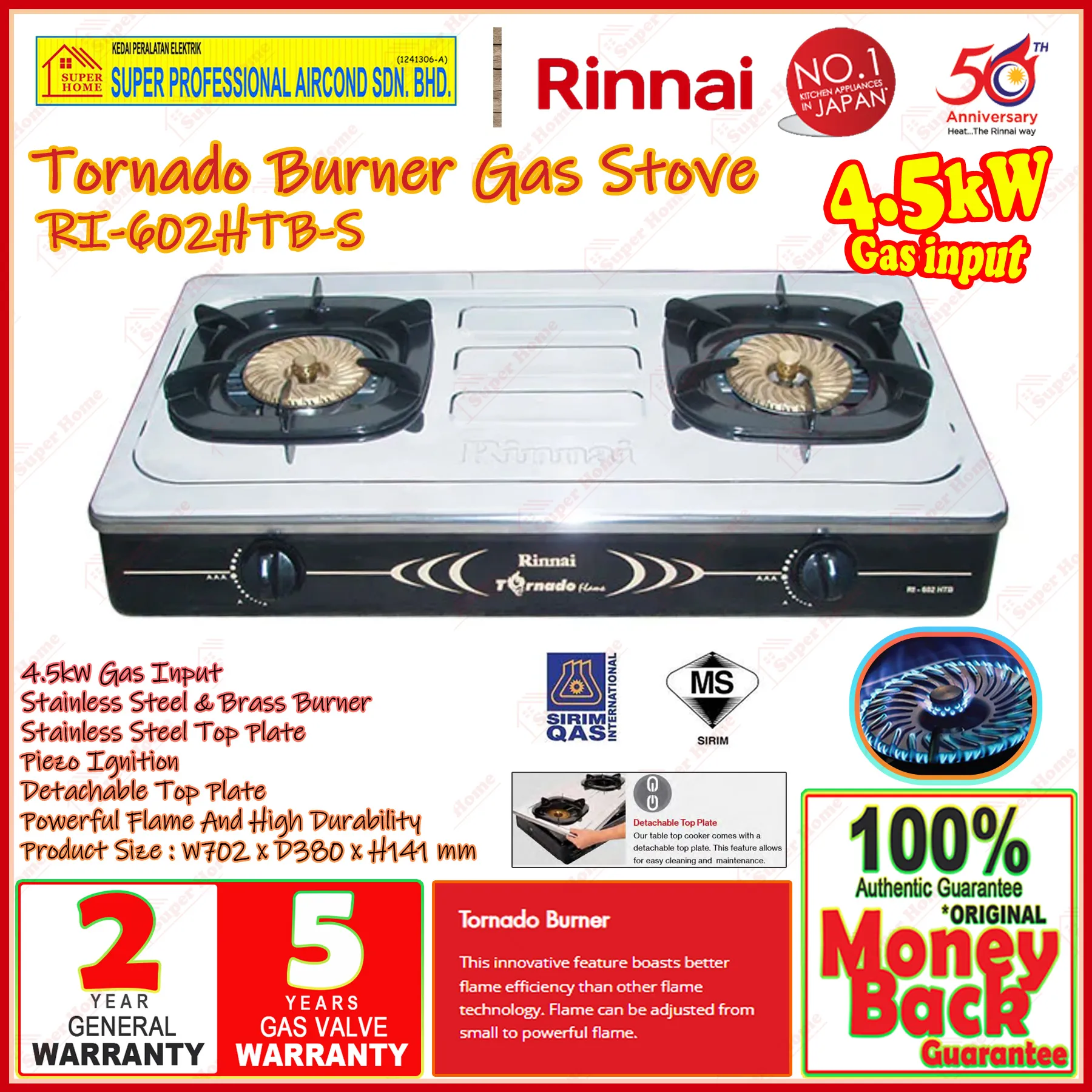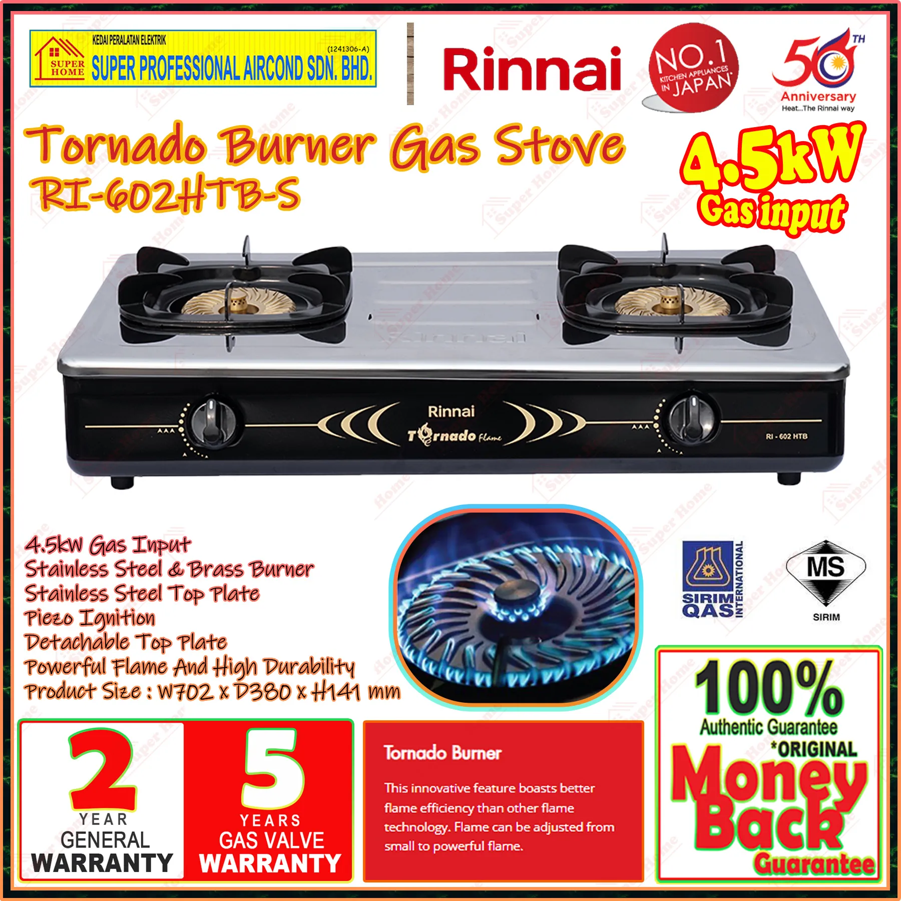 Super Professional Aircond Sdn Bhd Products Rinnai Gas Cooker RI-602HTB-S Tornado Burner Table Top Gas Stove
