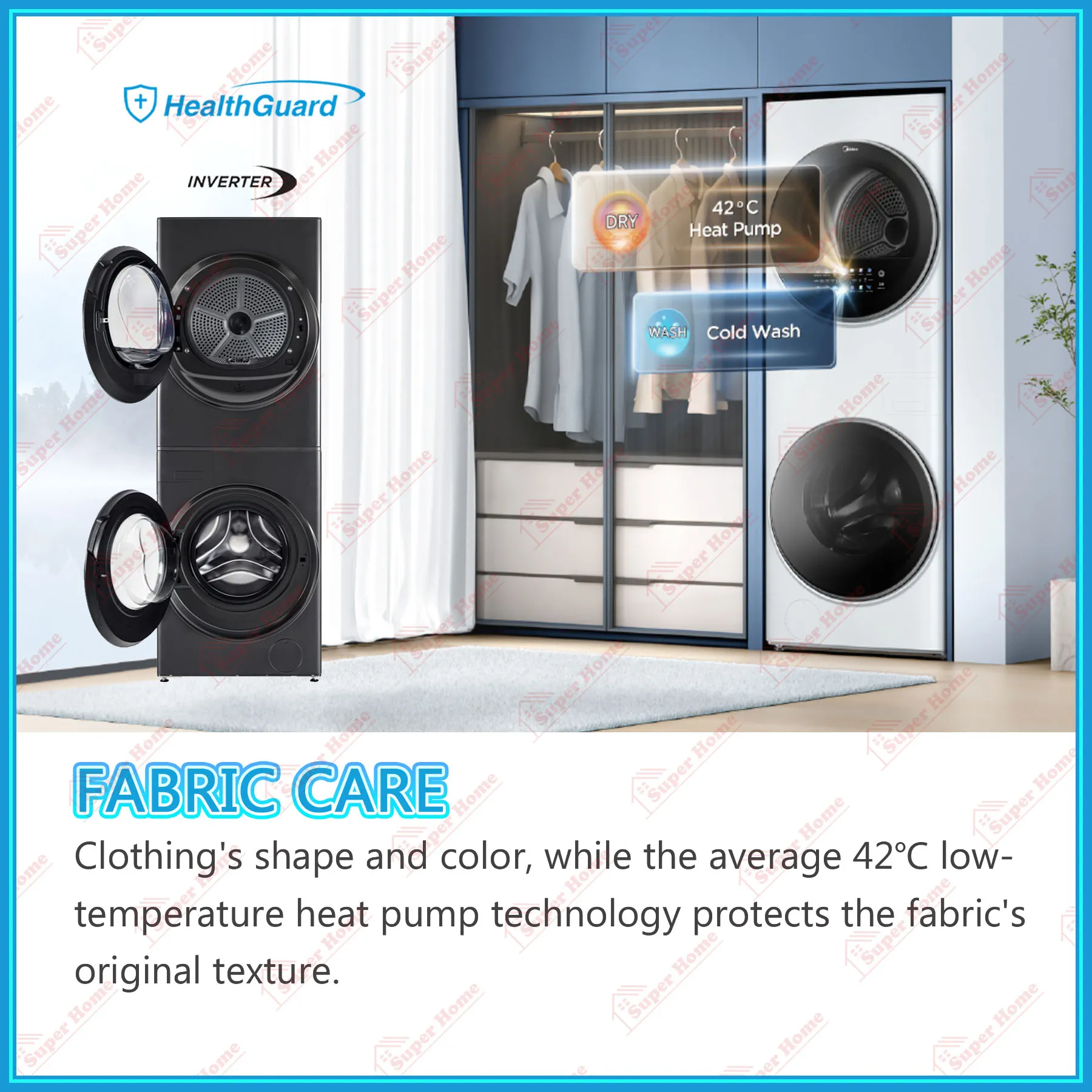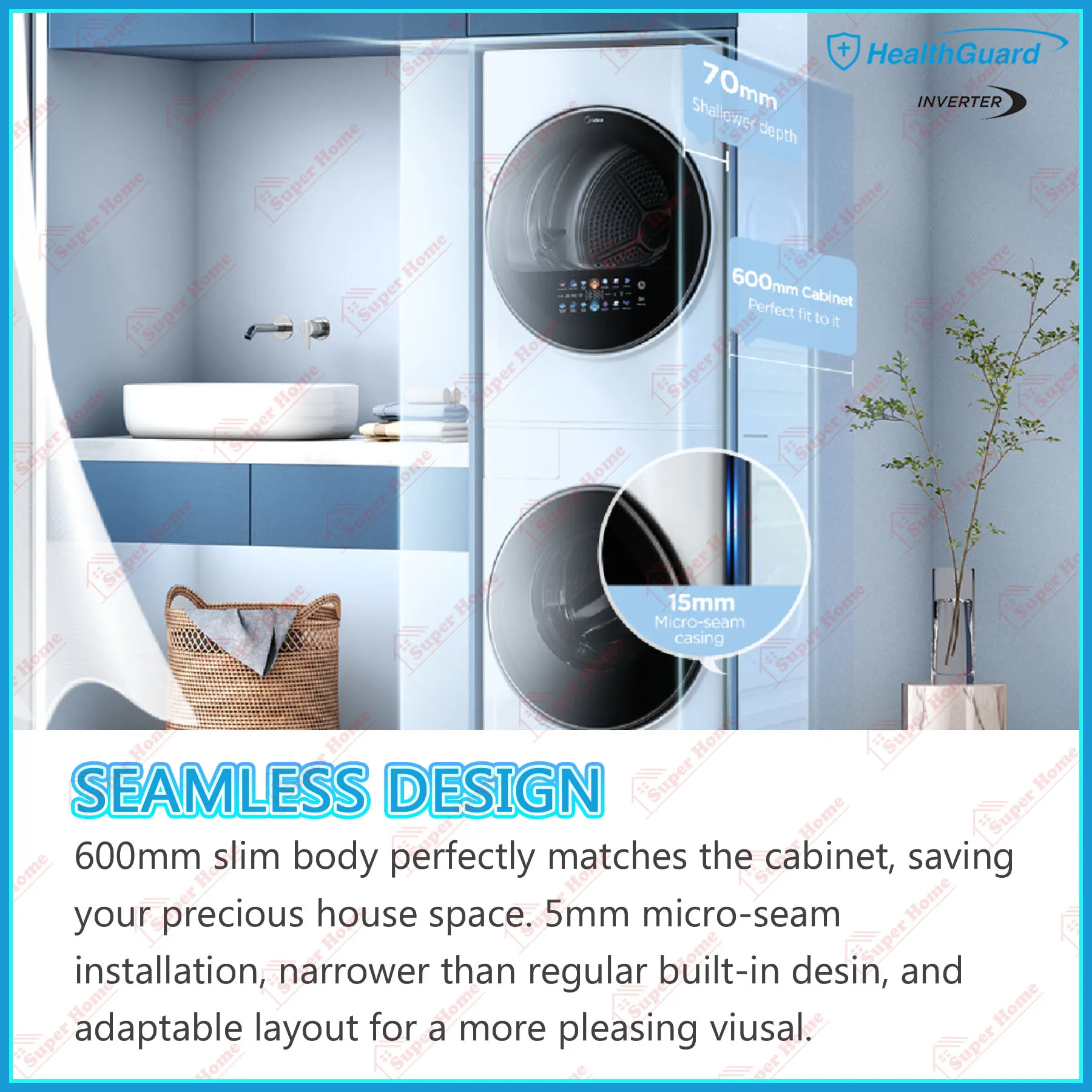 Highlights Midea Laundry Suite ML19F100D80WT Washer 10kg ML19F100D80WT-W Dryer 8kg ML19F100D80WT-D HealthGuard BLCD Motor (Inverter) INTEGRATED DESIGN 115CM Operating Height USER...