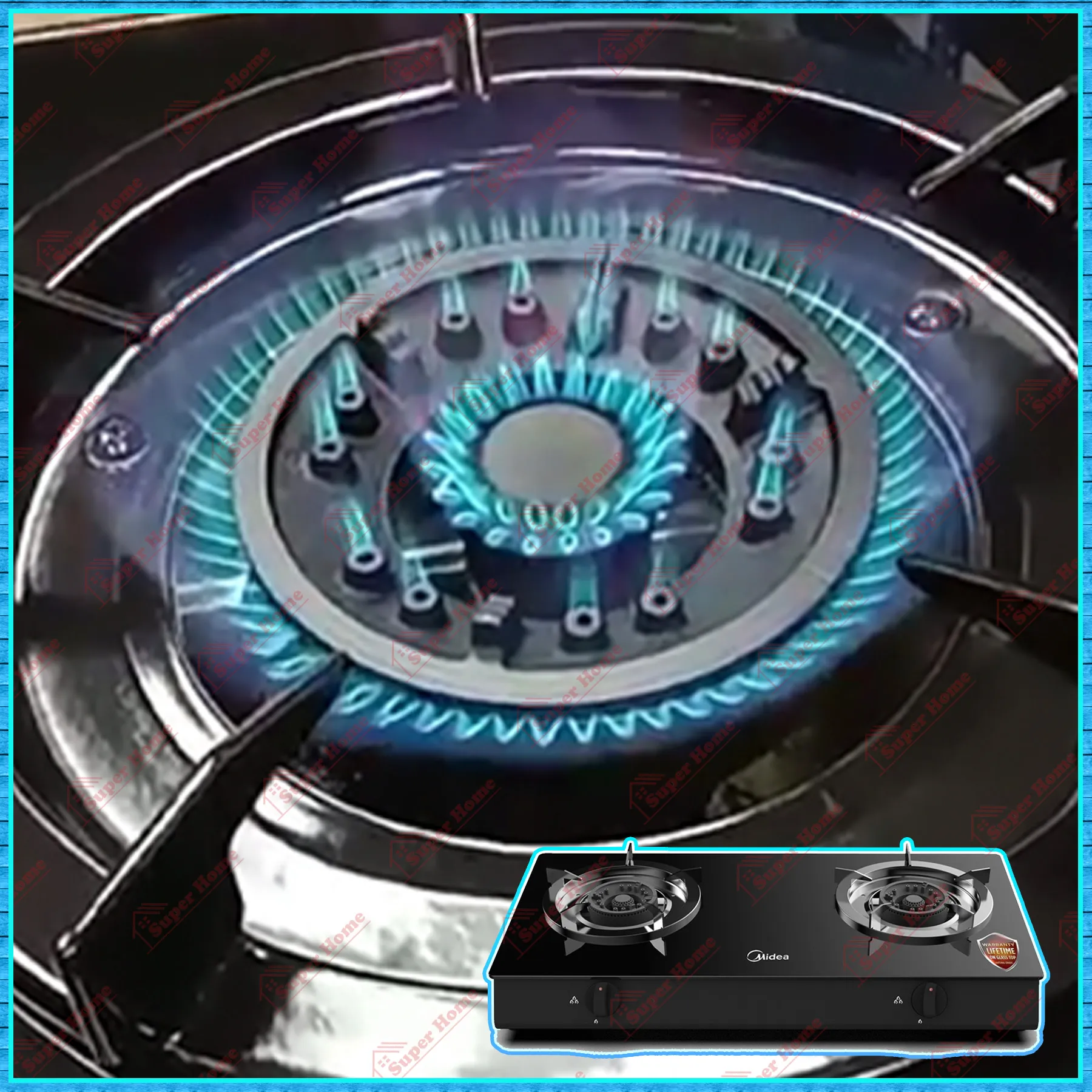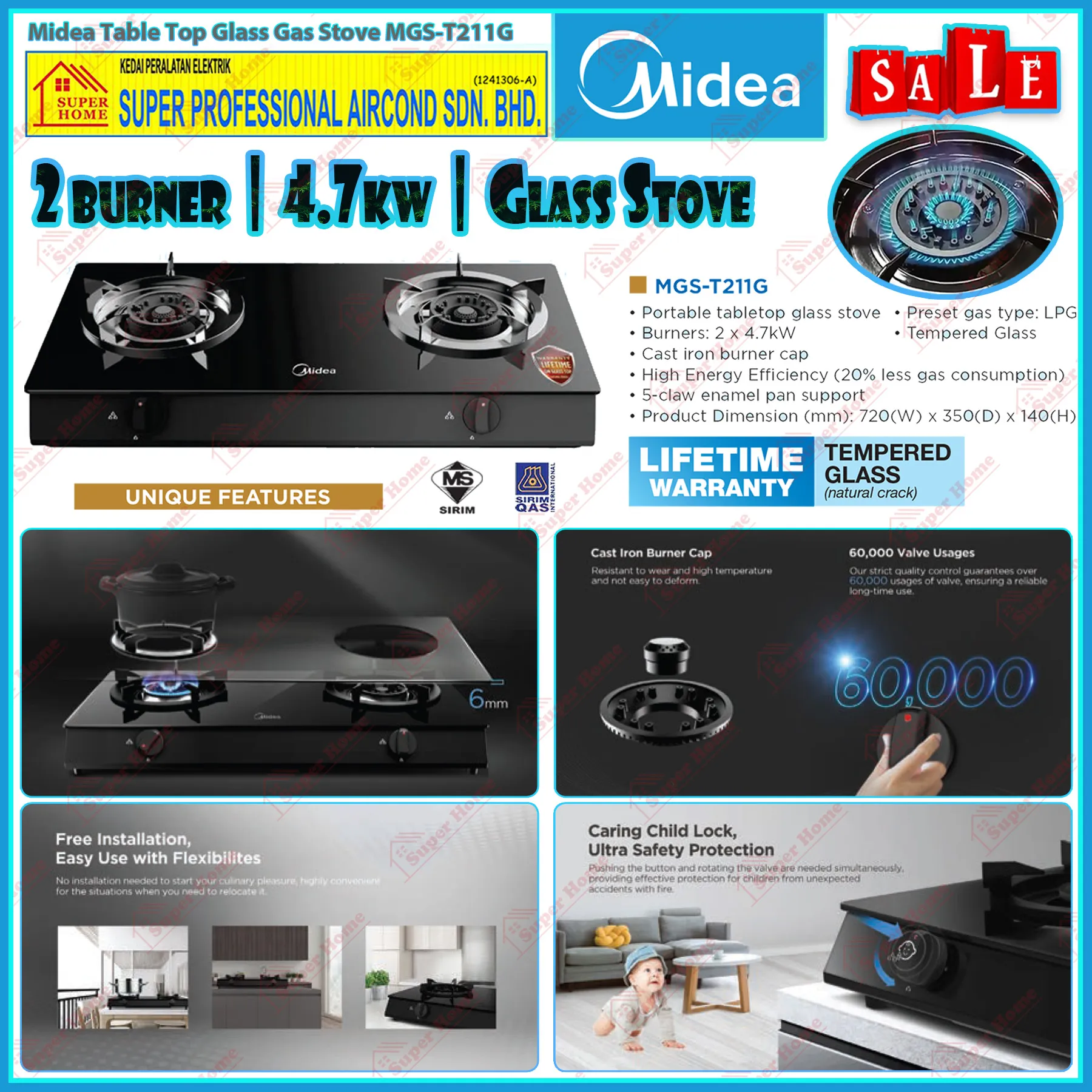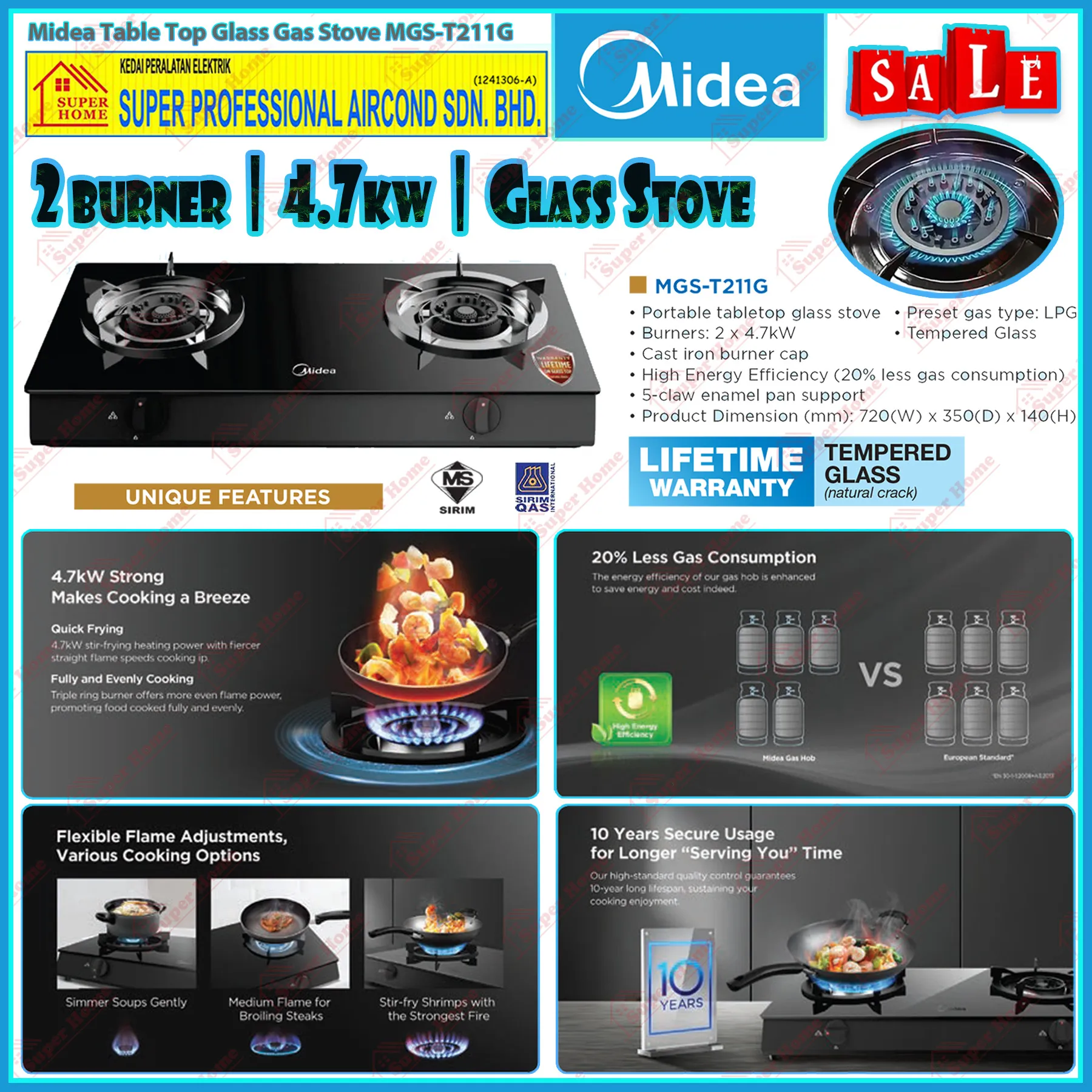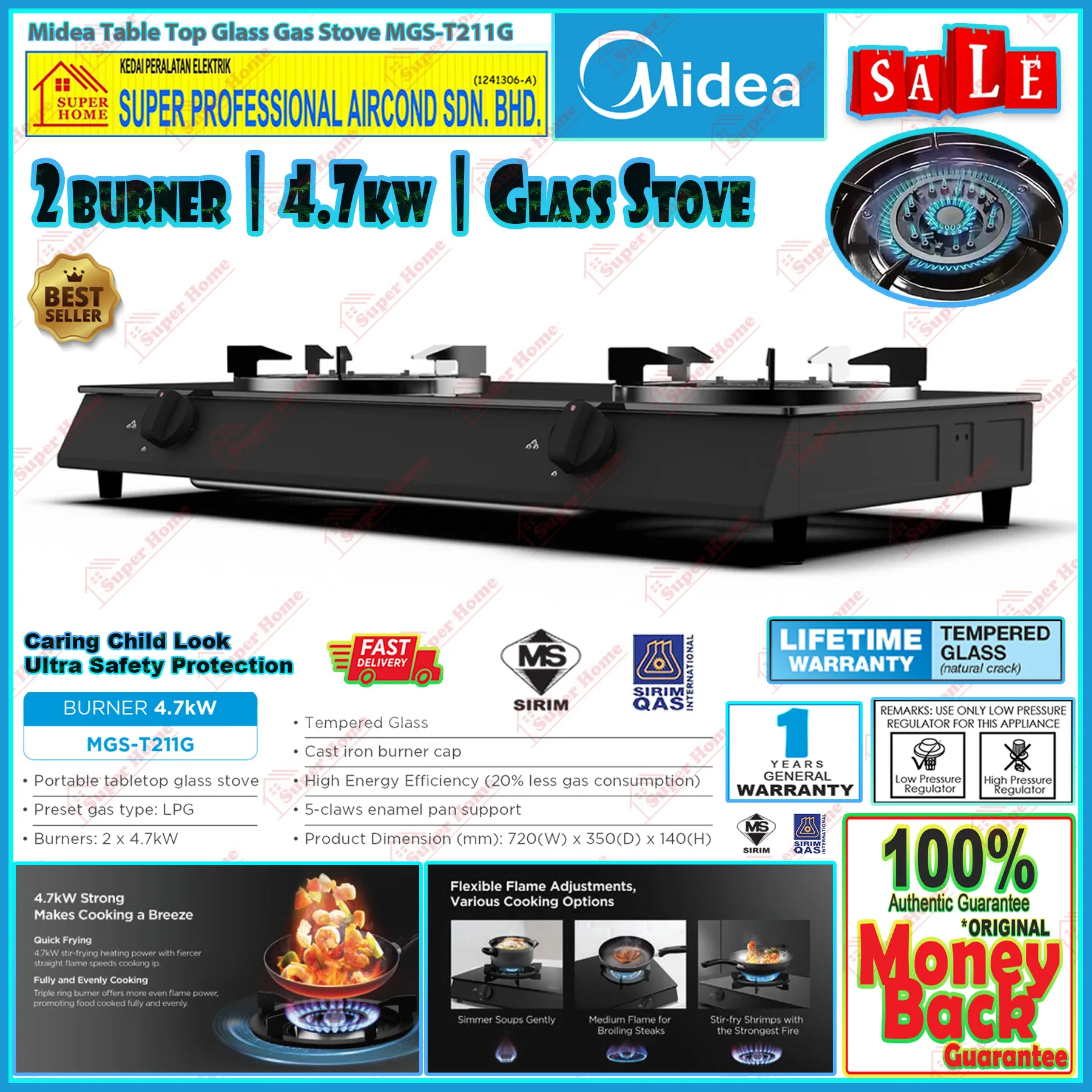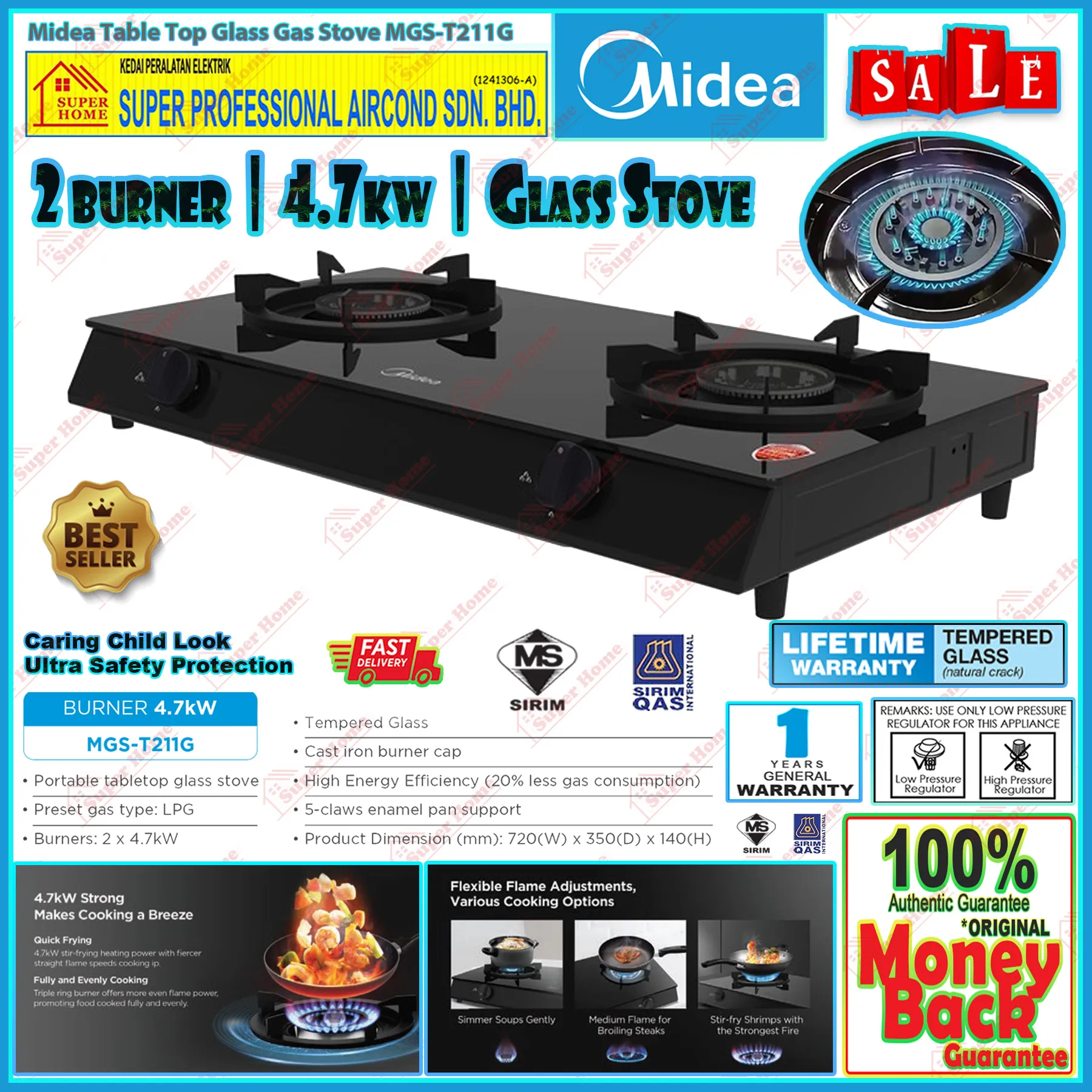 Super Professional Aircond Sdn Bhd Products Midea Gas Stove MGS-T211G Table Top Tempered Glass Top Gas Cooker (4.7kW)