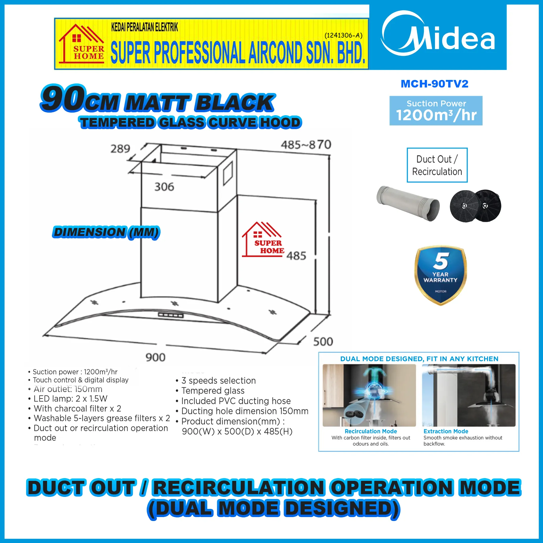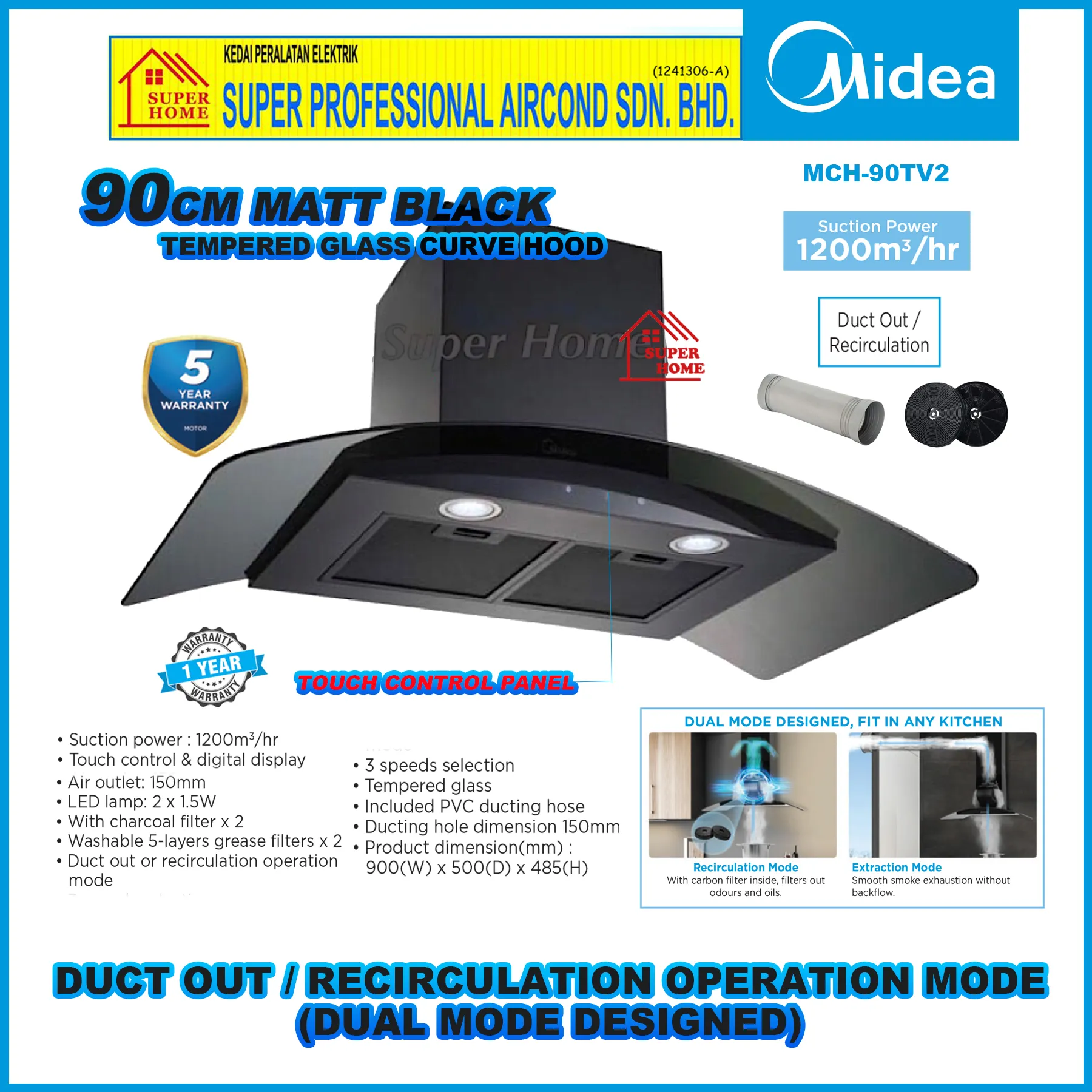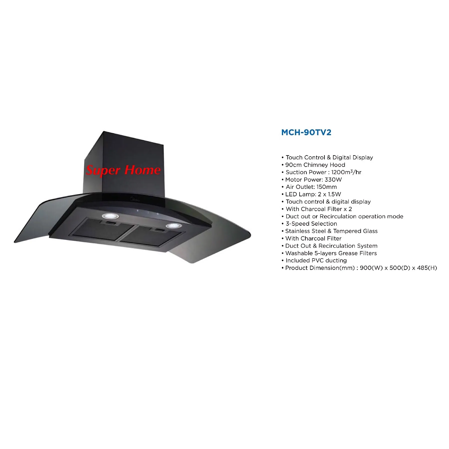 Super Professional Aircond Sdn Bhd Products Midea Chimney Hood MCH-90TV2 Curve Designer Cooker Hood - Suction Power 1200m³ - Touch Control & Digital Display (Exhaust / Recirculation Option)
