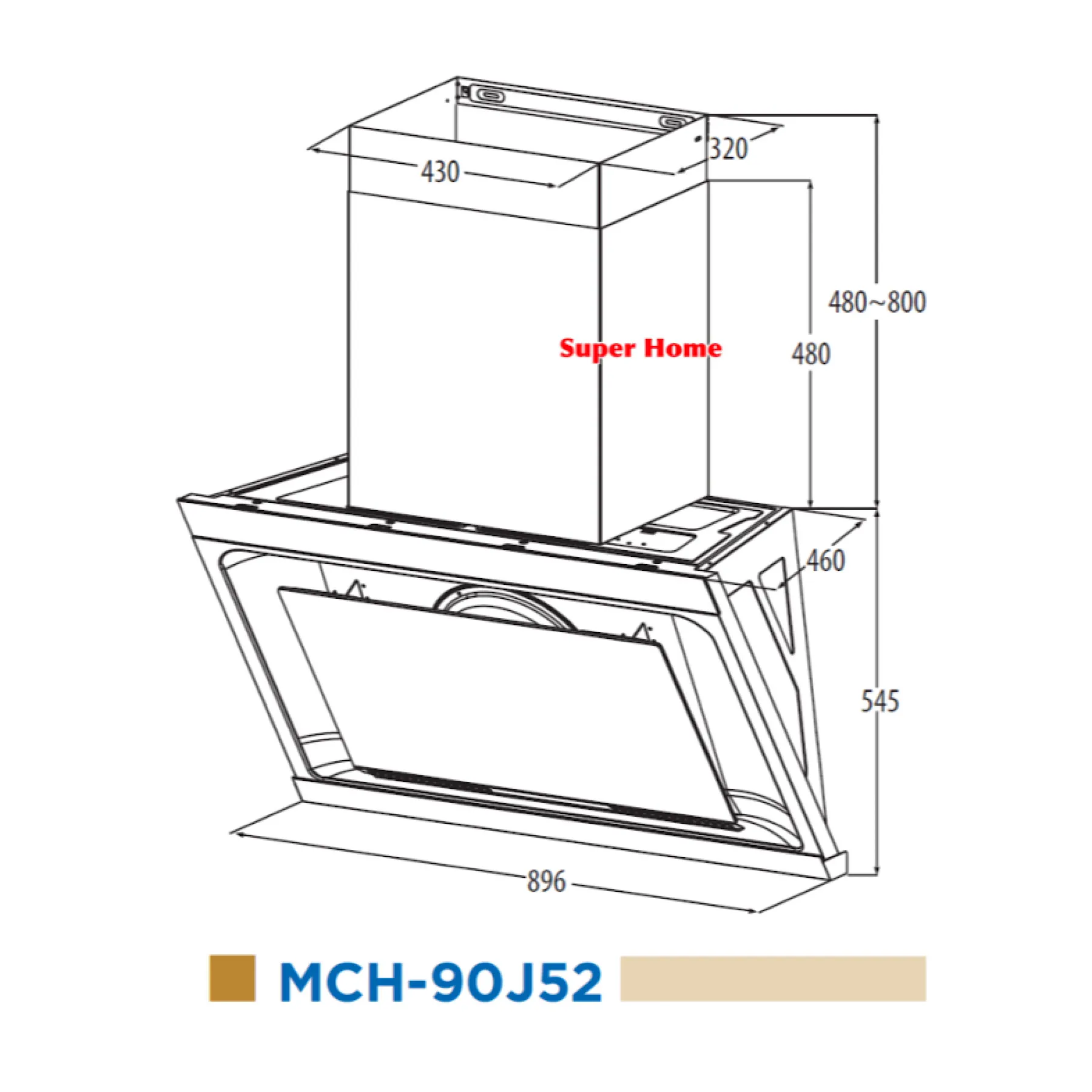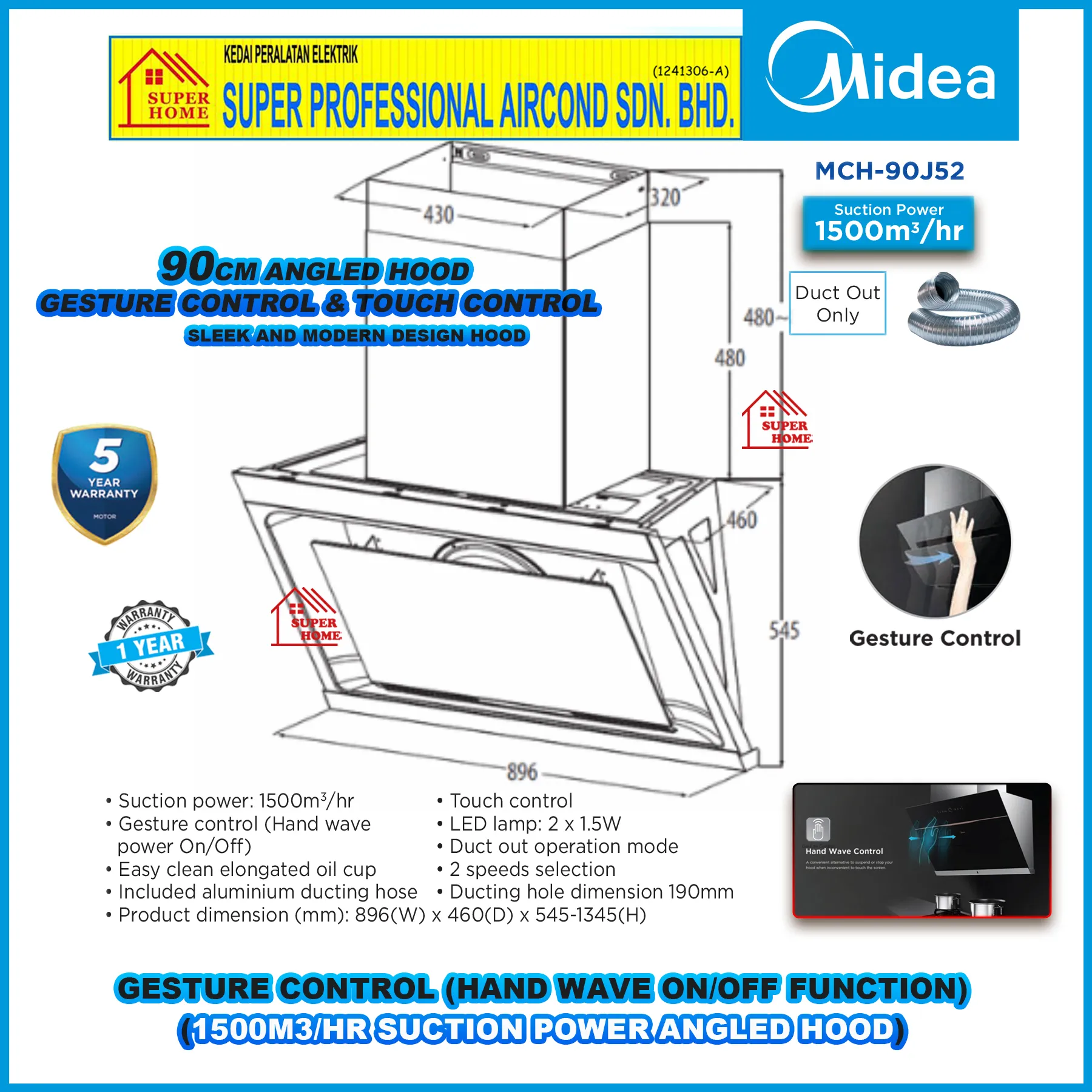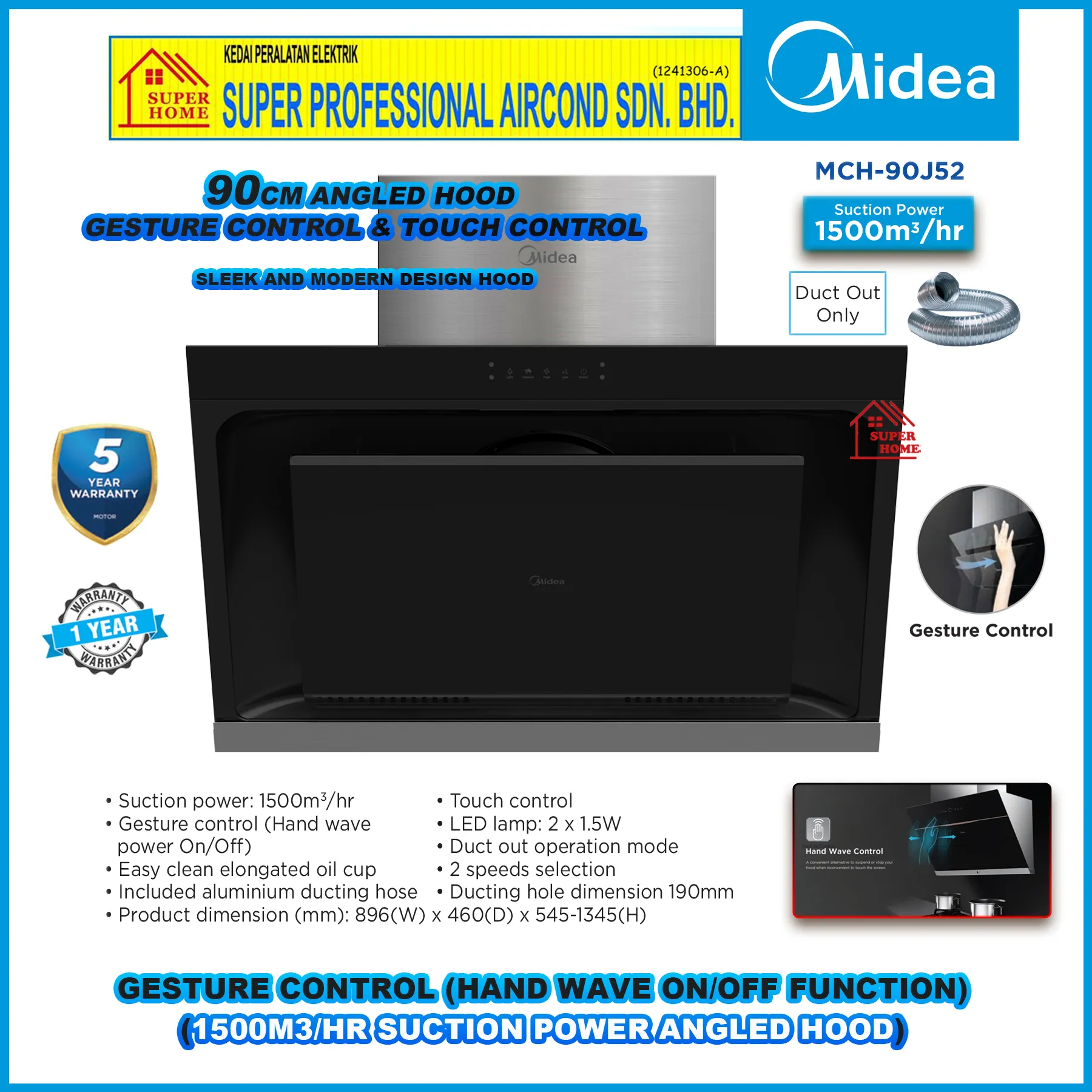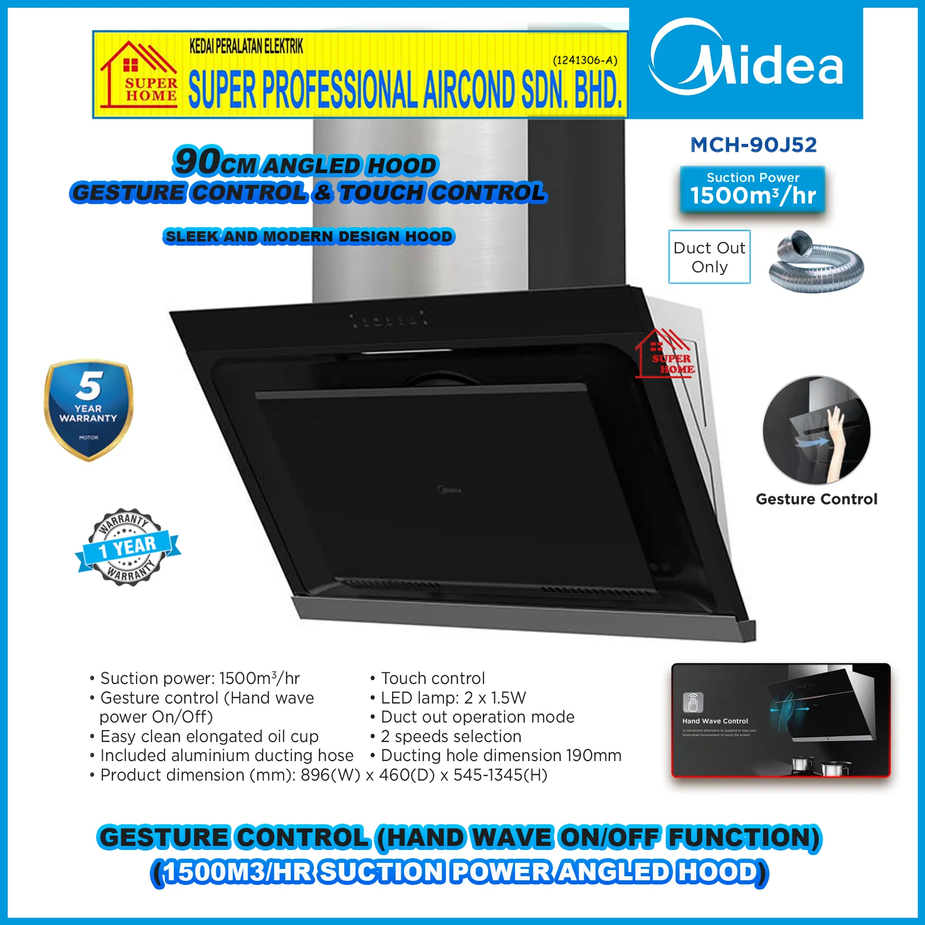 Super Professional Aircond Sdn Bhd Products Midea Cooker Hood MCH-90J52 90cm Angle Designer Hood 1500m³ With Gesture Control (Hand Wave On / Off Function)