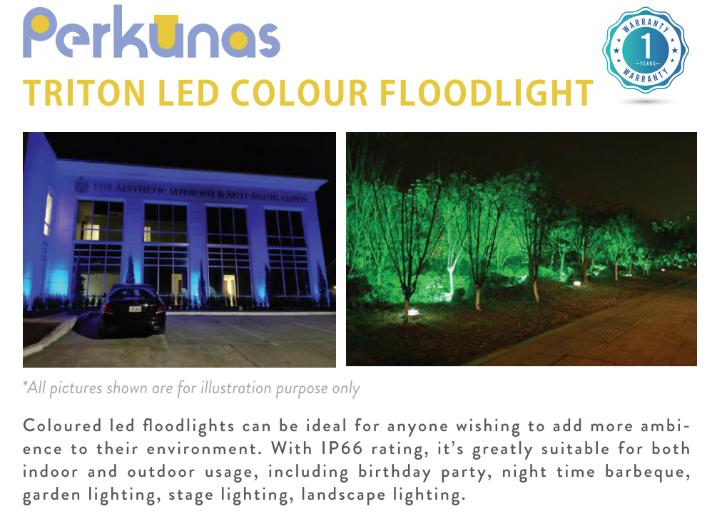 The PERKUNAS TRITON LED COLOUR FLOODLIGHT 320V 100W 8000LM 30,000HRS IP66 CRI80 [RED/GREEN/BLUE/PURPLE/YELLOW/RGB] stands out as one of the best-value LED floodlights in its class, combining powerful performance, long lifespan, and vibrant colour output at an affordable price.