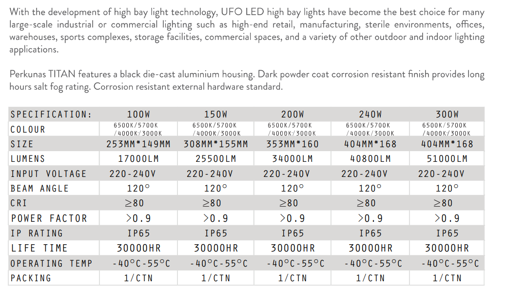 The PERKUNAS TITAN LED UFO HIGHBAY 240V 30,000HRS IP65 CRI80 [100W/150W/200W/240W/300W] [17000LM/25500LM/34000LM/40800LM/51000LM] [3000K/4000K/5700K/6500K] (SIRIM APPROVED) is a powerful and energy-efficient lighting solution designed for demanding industrial and commercial environments.