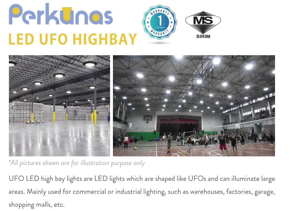 The PERKUNAS LED UFO HIGHBAY 265V 30,000HRS IP44 CRI90 [100W/150W/200W] [10000LM/15000LM/20000LM] [3000K/4000K/6500K] (SIRIM APPROVED) is a reliable and energy-efficient lighting solution designed for commercial and industrial high-ceiling environments.