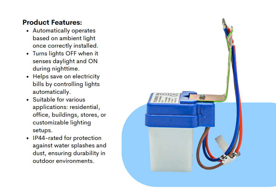 STARWAY PHOTOCELL DAYLIGHT SWITCH SENSOR 240V IP44 FEATURES – Photocell daylight switch sensor – Work automatically once it is correctly installed – When it senses the ...