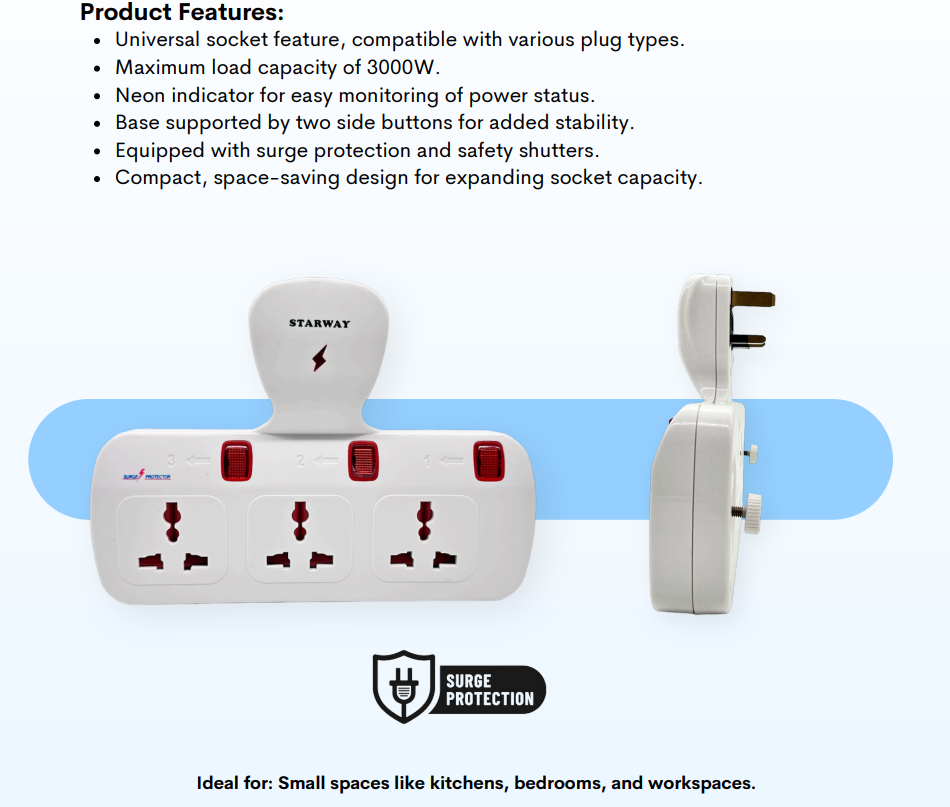STARWAY SW2313 3G T UNIVERSAL EXTENSION SOCKET ADAPTOR WITH SURGE PROTECTOR 3000W SPECIFICATIONS Max load : 3000W Voltage : 250V ~ 50Hz Fuse Rating : 13 Amps Product Features: -Univers...