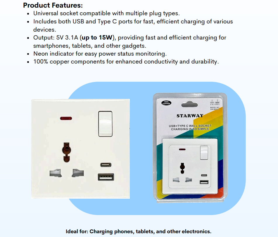 STARWAY 13A 1G UNIVERSAL WALL SOCKET USB + TYPE C 250V Product Features: -Universal socket compatible with multiple plug types. -Includes both USB and Type C ports for fast, efficient...