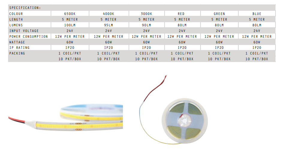 Available in multiple lumen density options (80LM / 90LM / 95LM / 100LM per meter) and a wide range of colour temperatures, including Warm White (3000K), Neutral White (4000K), Daylight (6500K), as well as Red, Blue, and Green, this COB LED strip provides excellent flexibility for different design and lighting needs.