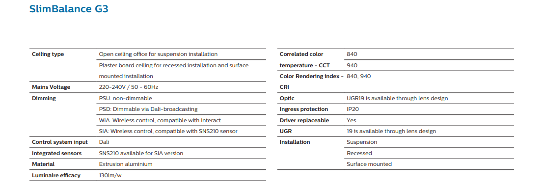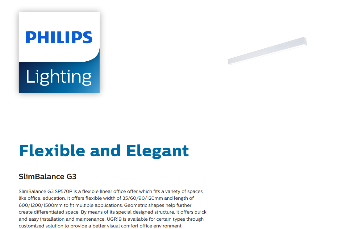 The PHILIPS SLIMBALANCE G3 SP570 LED LINEAR LIGHT 240V 4000K IP20 CRI90 [LED20/LED40] [16W/30W] [1950LM/4130LM] [2FEET/4FEET] [PENDANT/SURFACE/RECESSED] is a premium linear lighting solution designed to deliver high visual comfort, excellent colour accuracy, and modern architectural aesthetics.