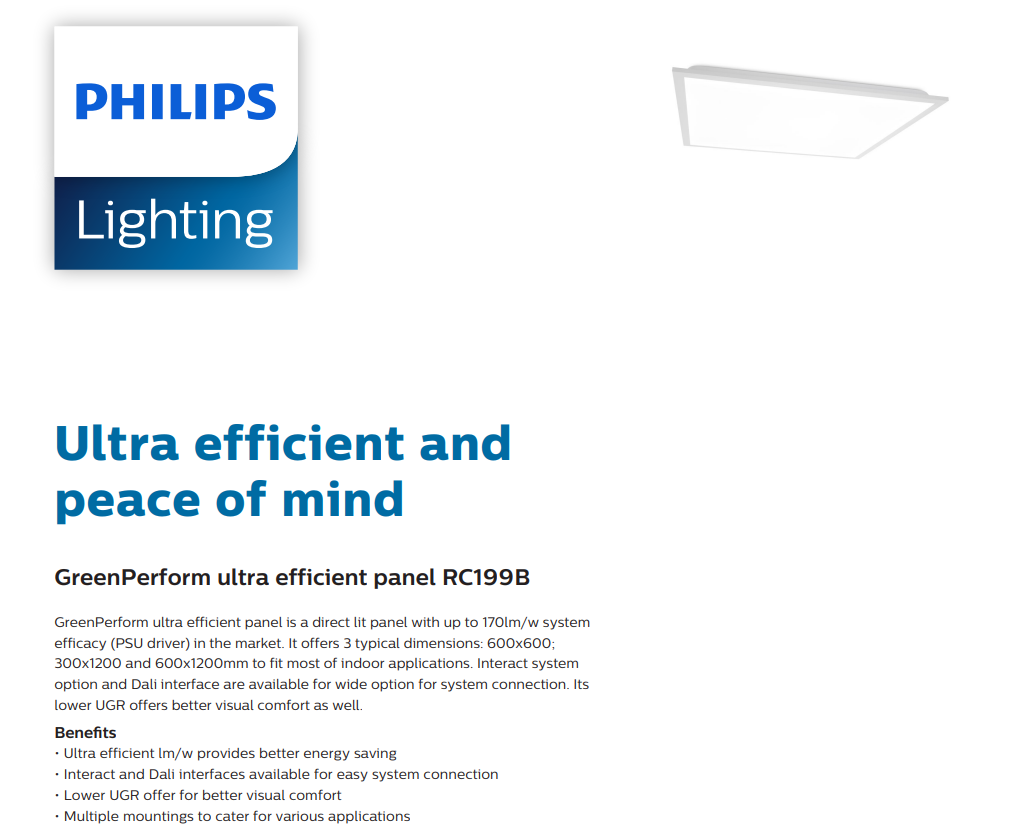 The PHILIPS GREENPERFORM ULTRA EFFICIENT RC199B RECESSED DIRECT PANEL 240V 4000K IP20 50,000HRS CRI80 & CRI90 [LED33/LED34/LED35/LED36/LED37/LED39/LED50/LED51/LED52/LED53/LED54/LED56/LED57] [2FEET/4FEET] is a premium recessed LED panel designed to deliver exceptional energy efficiency, visual comfort, and long-term reliability for modern commercial interiors.