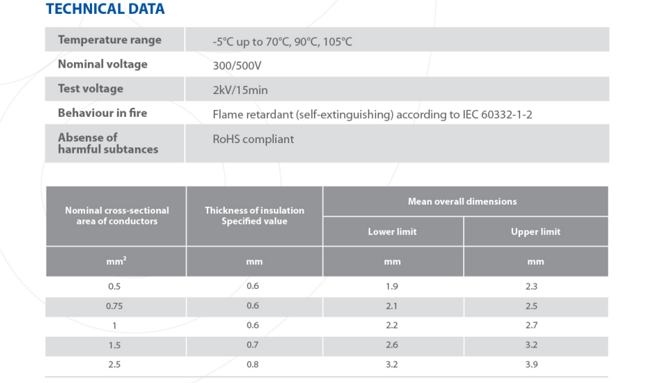 Conductor Sizes: 0.5mm² / 0.75mm² / 1.0mm² / 1.5mm² / 2.5mm²