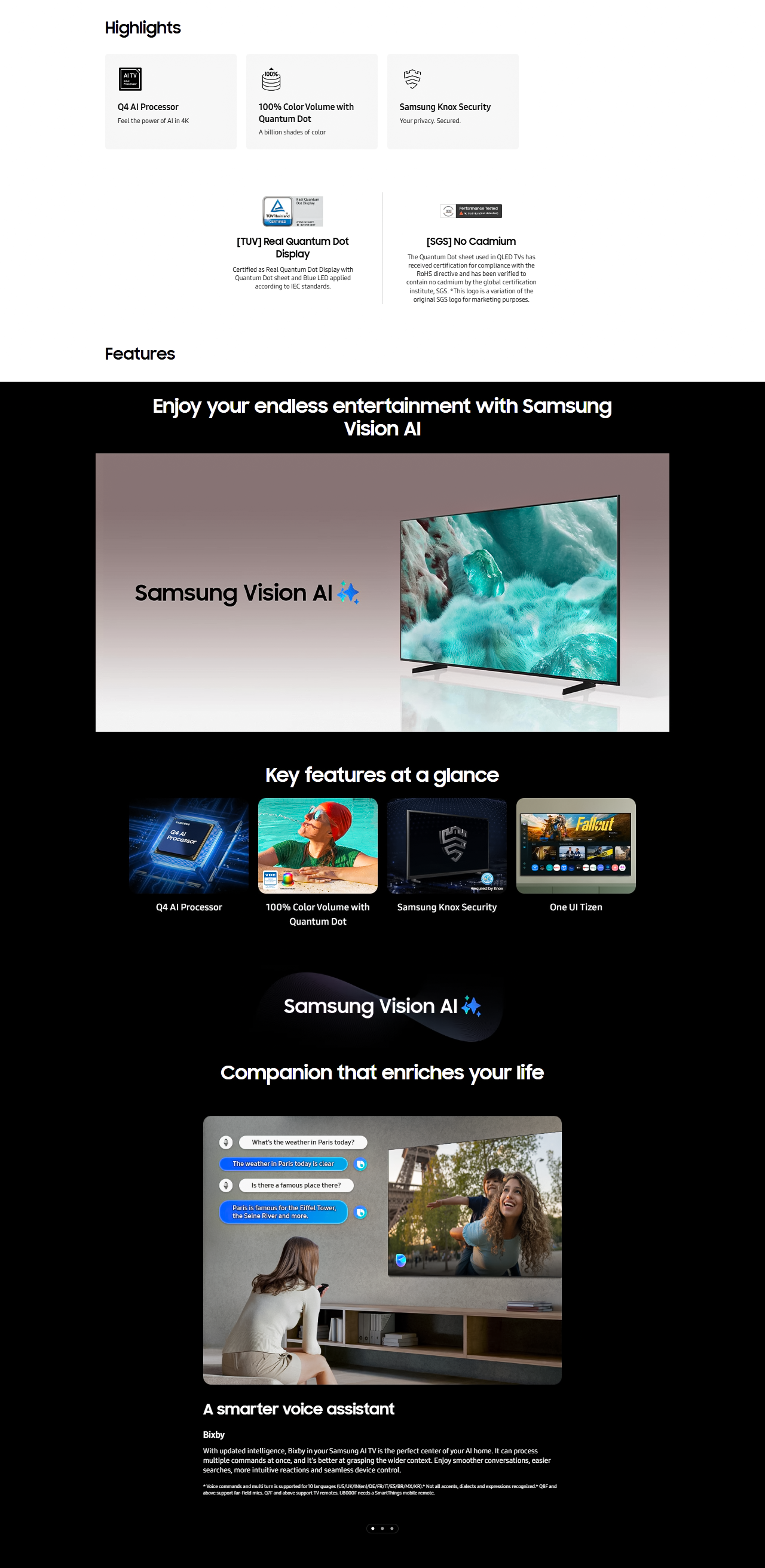 - [SGS] No Cadmium - The Quantum Dot sheet used in QLED TVs has received certification for compliance with the RoHS directive and has been verified to contain no cadmium by the global certification institute, SGS. *This logo is a variation of the original SGS logo for marketing purposes.