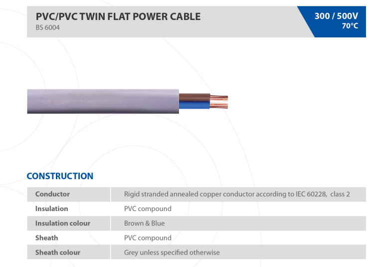 Constructed with high-quality PVC insulation, this cable offers excellent protection against mechanical stress and everyday wear while ensuring stable electrical performance. The twin flat design allows for neat cable routing and simple identification during installation, especially in residential and commercial environments.