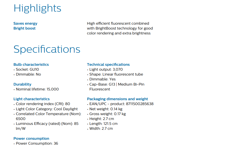 The lamp is dimmable (with compatible ballast), allowing flexible light control to suit different environments and energy-saving needs. With a long service life of up to 15,000 hours, the PHILIPS TL-D Super 80 helps reduce maintenance costs while maintaining consistent performance throughout its lifespan.