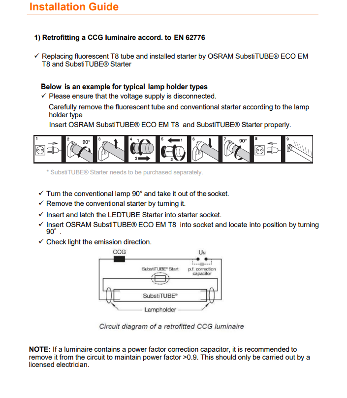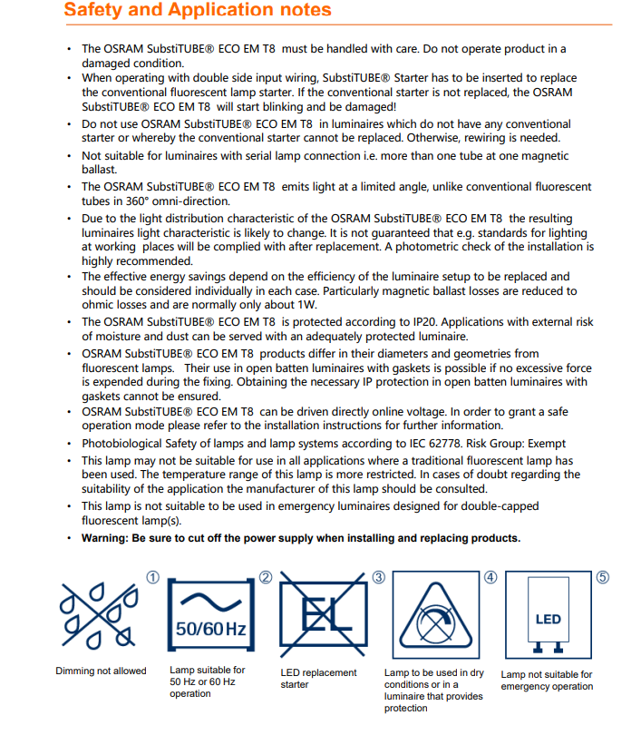 - Direct replacement for T8 fluorescent tubes with EM ballast