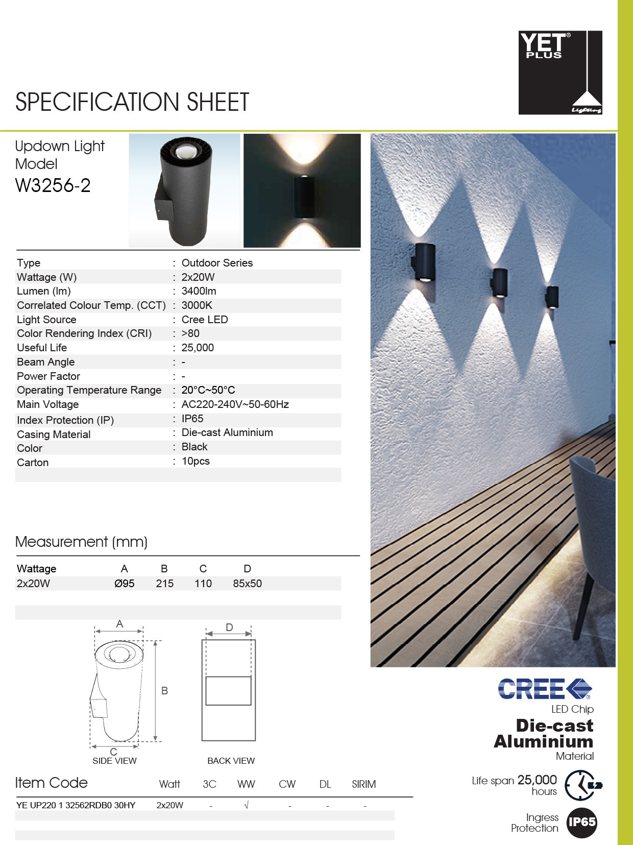 Designed for energy efficiency and low maintenance, the YETPLUS W3256-2 OUTDOOR LED UPDOWN WALL LIGHT 240V 40W 3400LM 3000K 25,000HRS IP65 CRI80 (BLACK) is an excellent choice for homeowners, contractors, and commercial projects seeking a high-output, weatherproof up down wall light at great value.