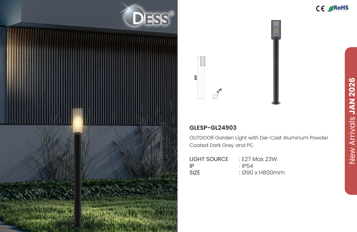 The DESS GLESP-GL24903 E27 OUTDOOR GARDEN LIGHT FITTING MAX 23W IP54 combines functionality with modern outdoor aesthetics, making it an excellent choice for enhancing garden ambience, improving pathway visibility, and elevating landscape design.