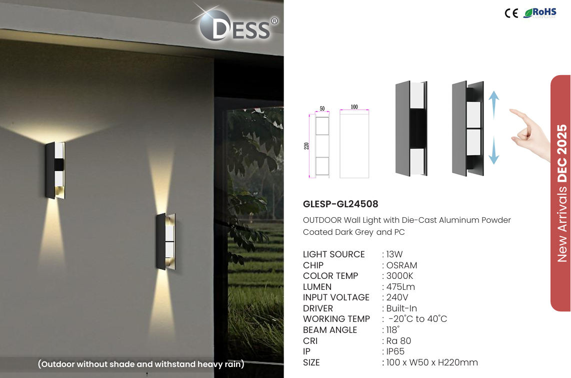 Upgrade your exterior lighting with the modern and durable DESS GLESP-GL24508 OUTDOOR LED WALL LIGHT 240V 13W 475LM 3000K IP65 CRI80, designed to deliver both functional illumination and decorative wall effects. Ideal for residential and commercial applications, this stylish up down wall light enhances building facades, corridors, gardens, and pathways with warm and welcoming lighting.