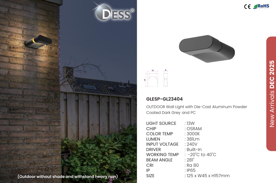 Enhance your outdoor spaces with the sleek and durable DESS GLESP-GL23404 OUTDOOR LED WALL LIGHT 240V 13W 381LM 3000K IP65 CRI80, a premium lighting solution designed for modern exterior applications. Perfect for residential and commercial settings, this LED wall light delivers reliable illumination while elevating the visual appeal of building facades, entrances, balconies, and garden walls.