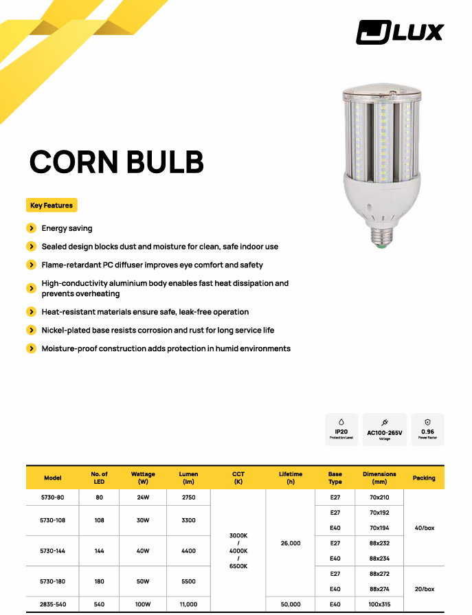 Upgrade your lighting efficiency with the JLUX 5730/2835 LED CORN BULB 265V IP20 [E27/E40] [24W/30W/40W/50W/100W] [2750LM/3300LM/4400LM/5500LM/11000LM] [3000K/4000K/6500K] [26000HRS/50000HRS], a powerful and energy-saving lighting solution designed for commercial, industrial, and residential applications. Manufactured under JLUX (OEM), this LED corn bulb delivers exceptional brightness, long lifespan, and reliable performance.