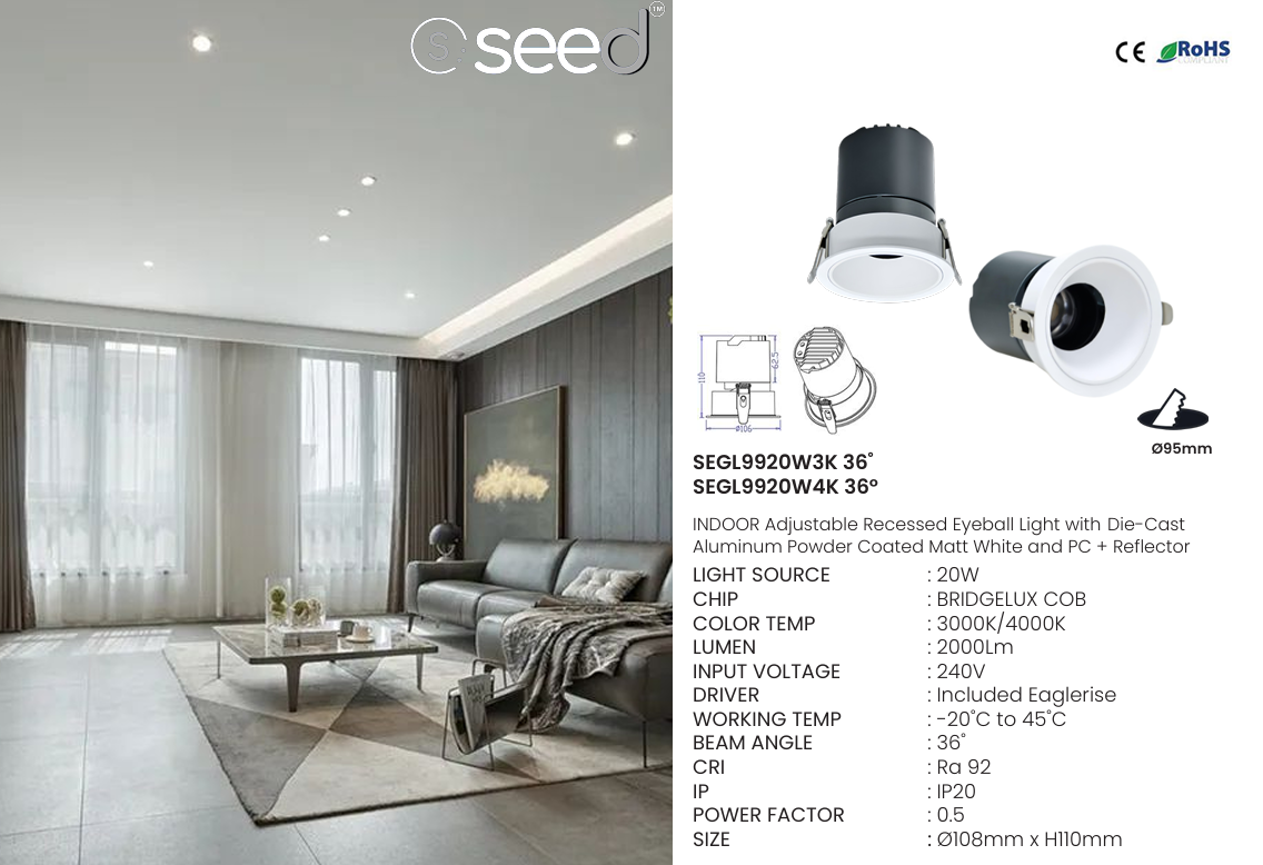 JLL Electrical Sdn Bhd Products SEED SEGL9920W INDOOR ADJUSTABLE RECESSED LED EYEBALL 240V 20W 2000W 36D IP65 CRI92 [3000K/4000K]
