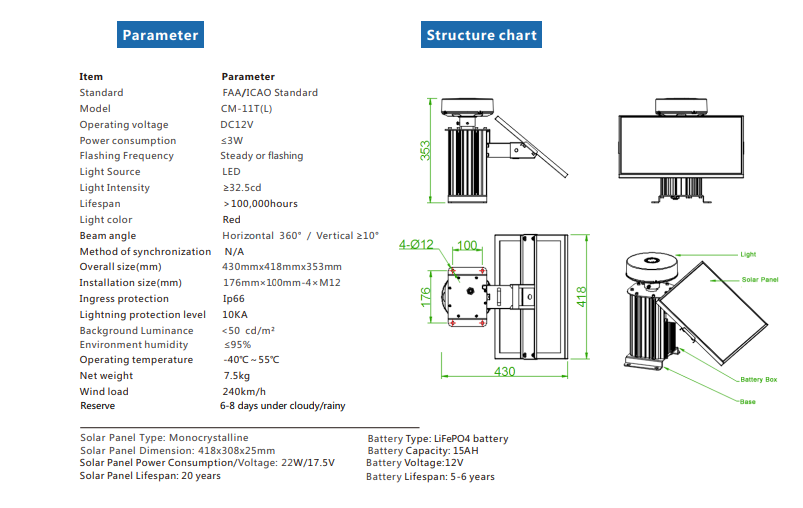Engineered for energy efficiency, the JLUX CM-11T(L) utilizes a 3W low intensity LED that produces bright and consistent red illumination while maintaining minimal power consumption. Its integrated solar power system with lithium battery storage ensures continuous operation even in low sunlight conditions, making it ideal for remote and off-grid installations.