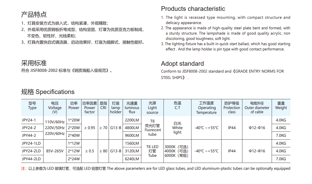 The JLUX MARINE OFFSHORE T8 FLUORESCENT CEILING LIGHT FITTING ONLY IP44 [120W/220W/240W/112W/212W/224W] [T8 FLUORESCENT TUBE/T8 LED TUBE] [2FEET/4FEET] is a versatile and durable marine-grade lighting fixture engineered for offshore vessels and industrial marine environments. Manufactured under JLUX (OEM), this ceiling fitting is designed to withstand humid, coastal, and high-salinity conditions commonly found in marine applications.